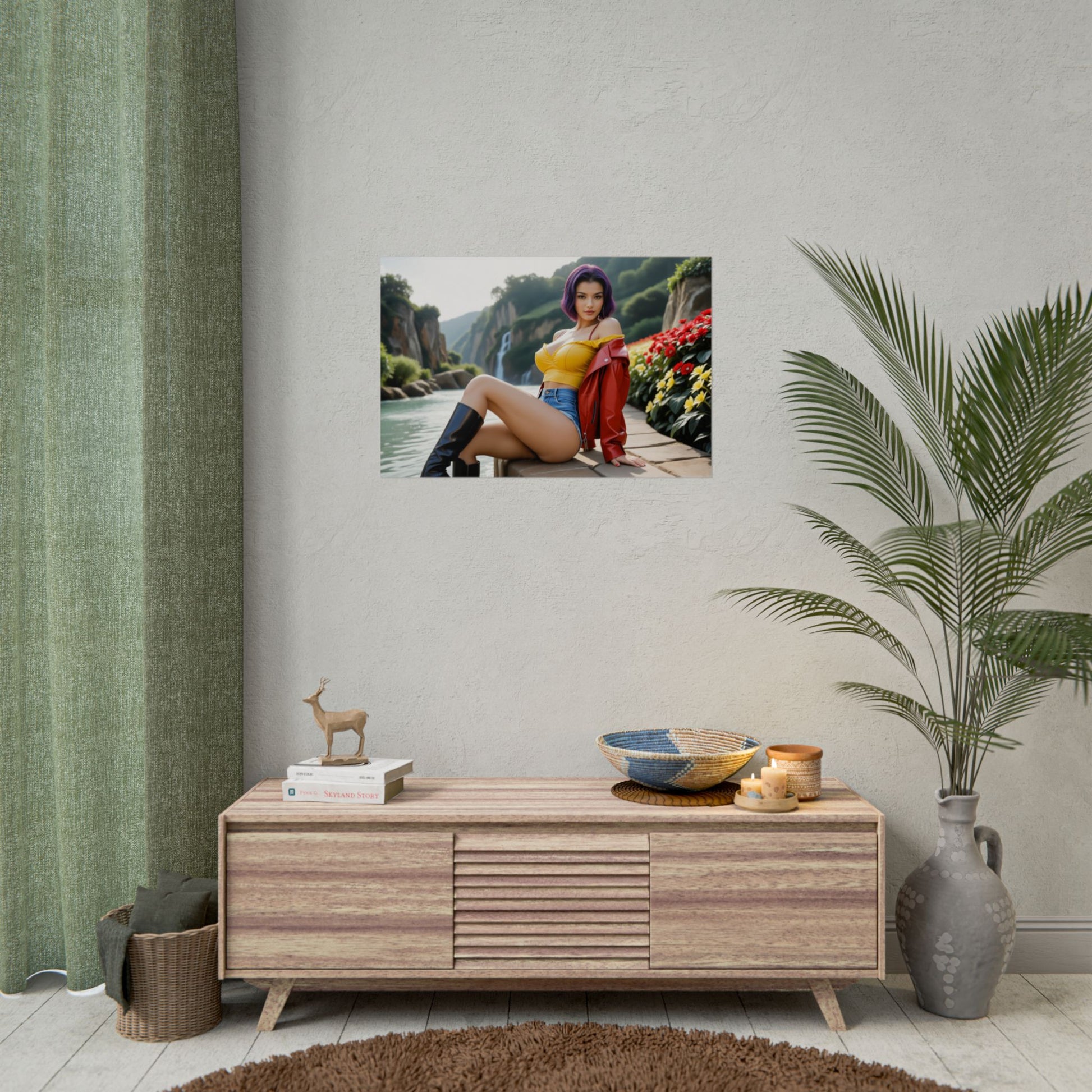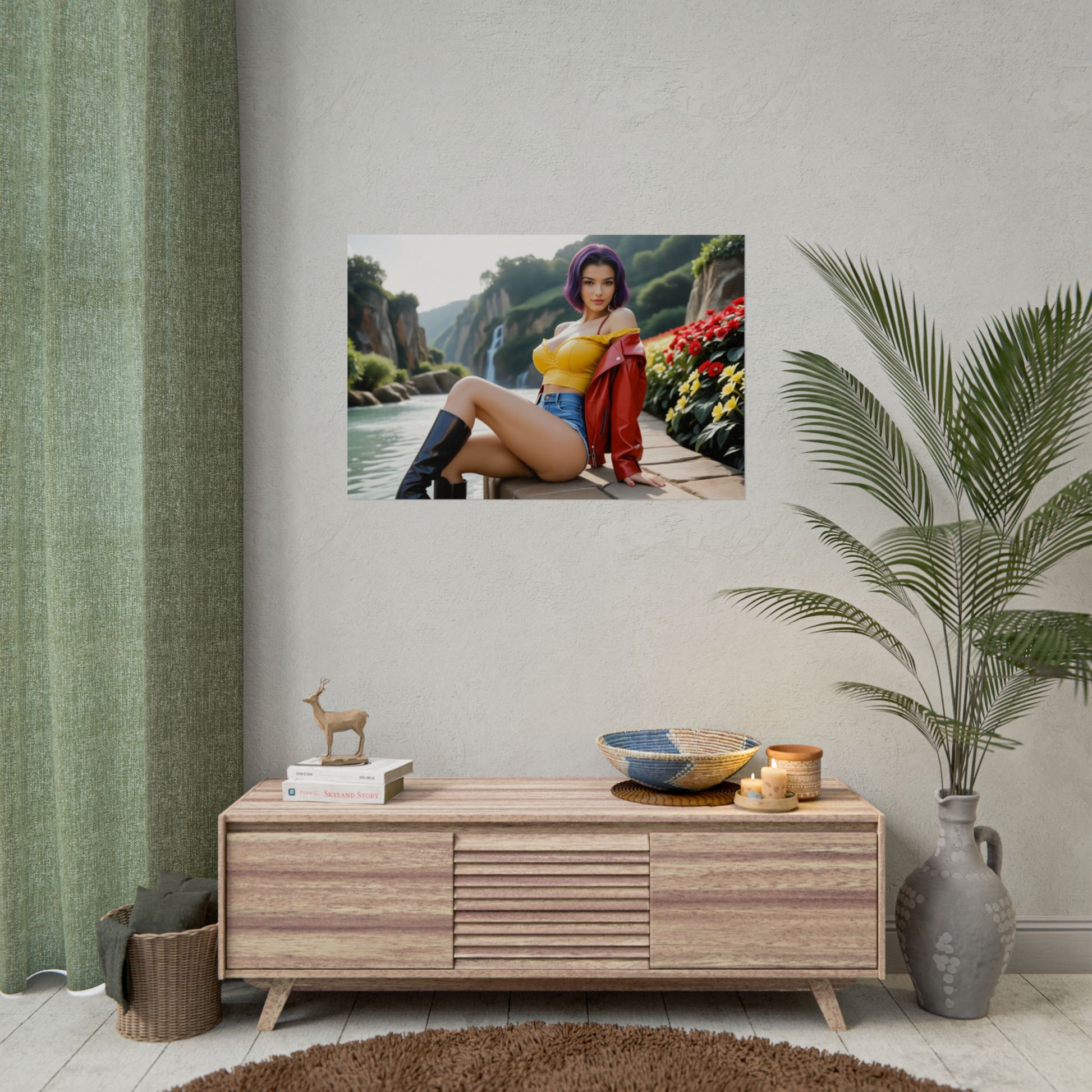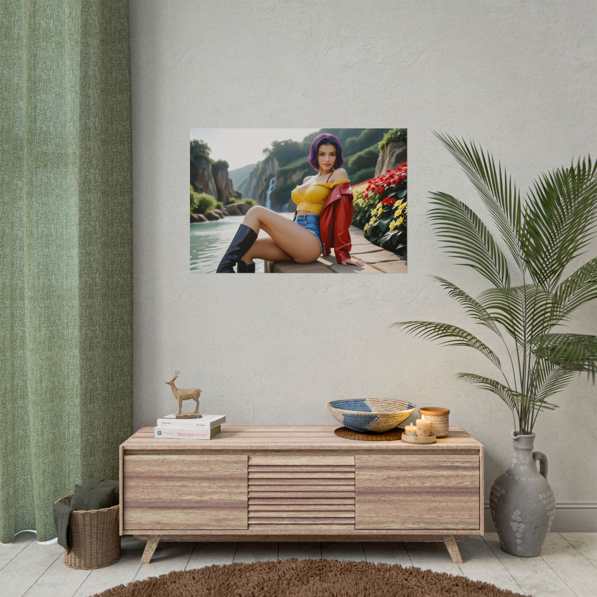 Dieser Druck fängt Fayes Balance aus Stil und Lässigkeit perfekt ein. Ihre selbstbewusste Haltung und die stimmungsvolle Farbpalette schaffen die Atmosphäre für einen außergewöhnlichen Raum im Anime-Stil.