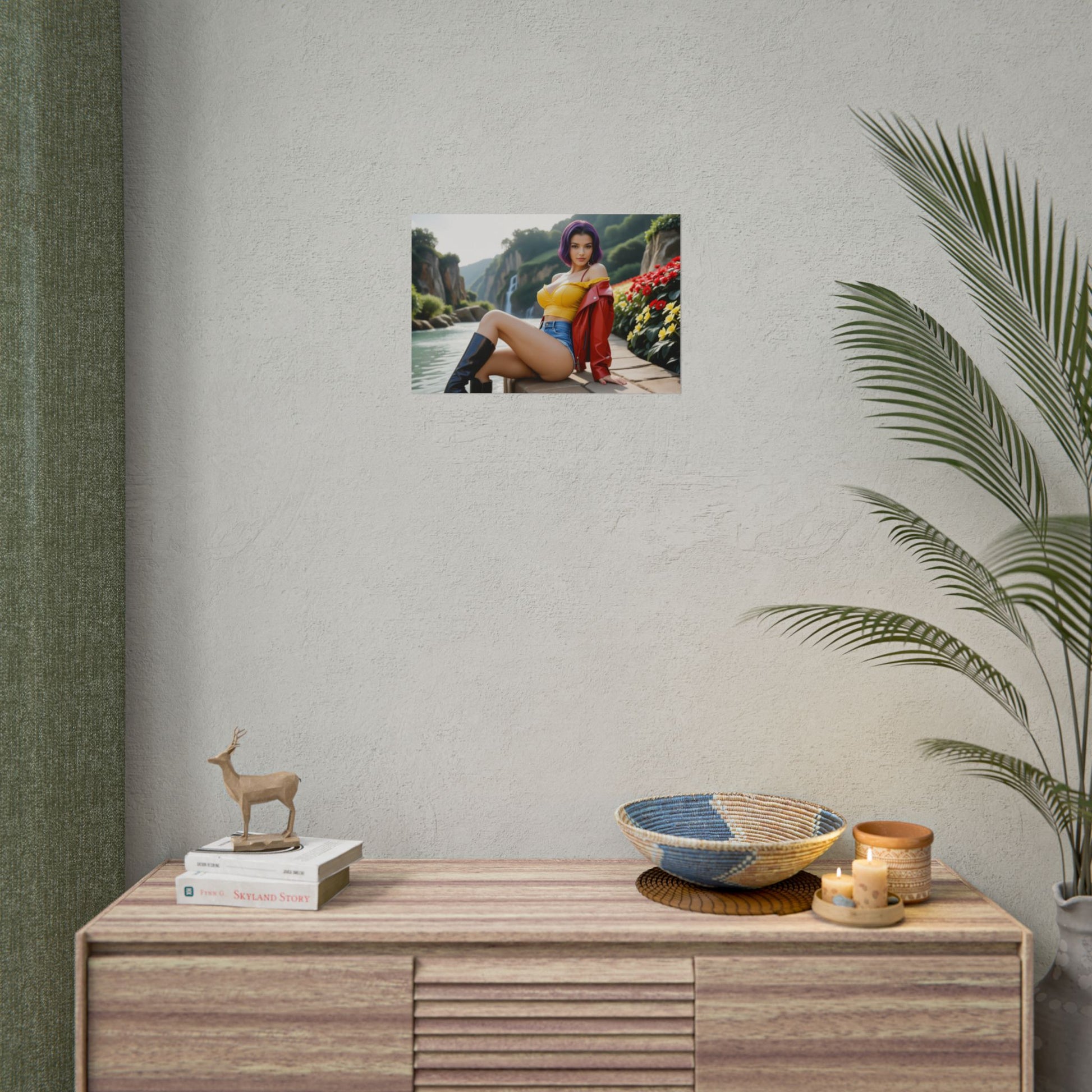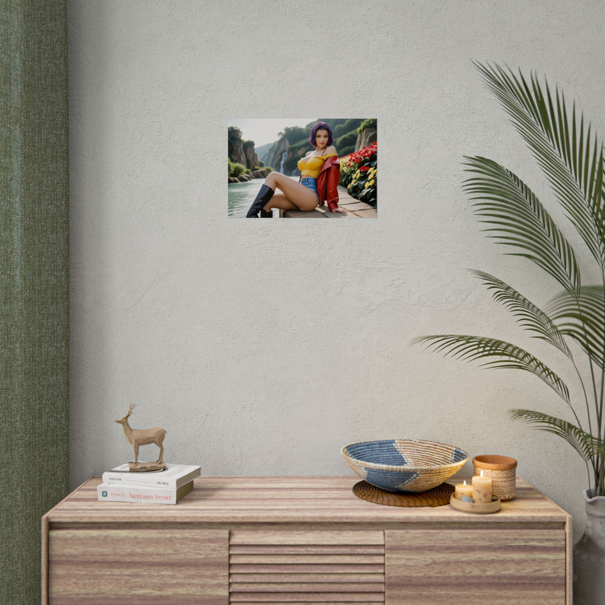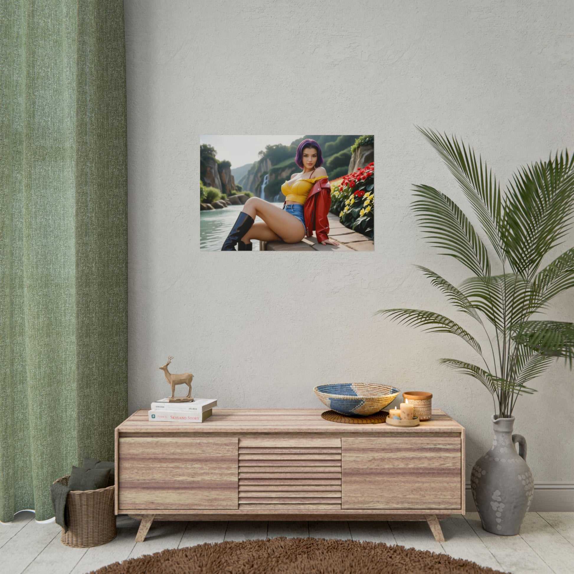 Dieser Druck fängt Fayes Balance aus Stil und Lässigkeit perfekt ein. Ihre selbstbewusste Haltung und die stimmungsvolle Farbpalette schaffen die Atmosphäre für einen außergewöhnlichen Raum im Anime-Stil.
