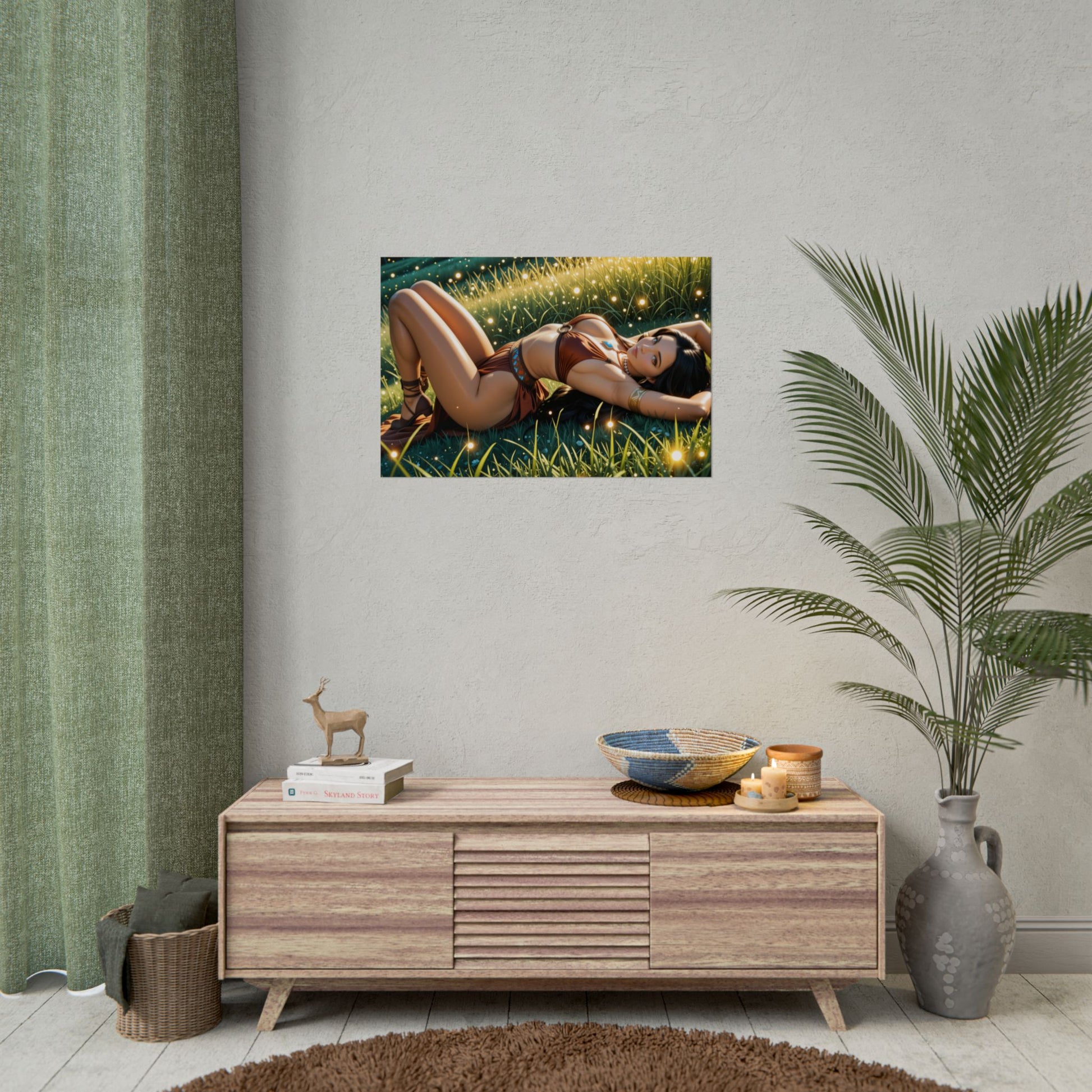 Dieses Kunstwerk im Anime-Stil zeigt Pocahontas – gelassen, stark und tief mit der Natur verbunden. Ihr wallendes Haar, ihre erdfarbene Kleidung und ihr ruhiger Ausdruck strahlen Harmonie und Mut aus. Ein perfektes Wandbild für Fans von Fantasy-Heldinnen und friedvollen Einrichtungsstilen.