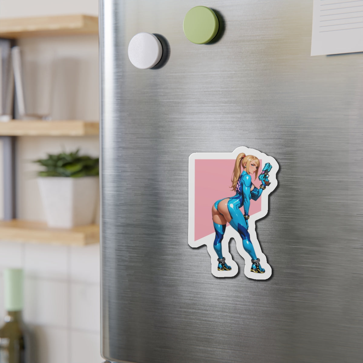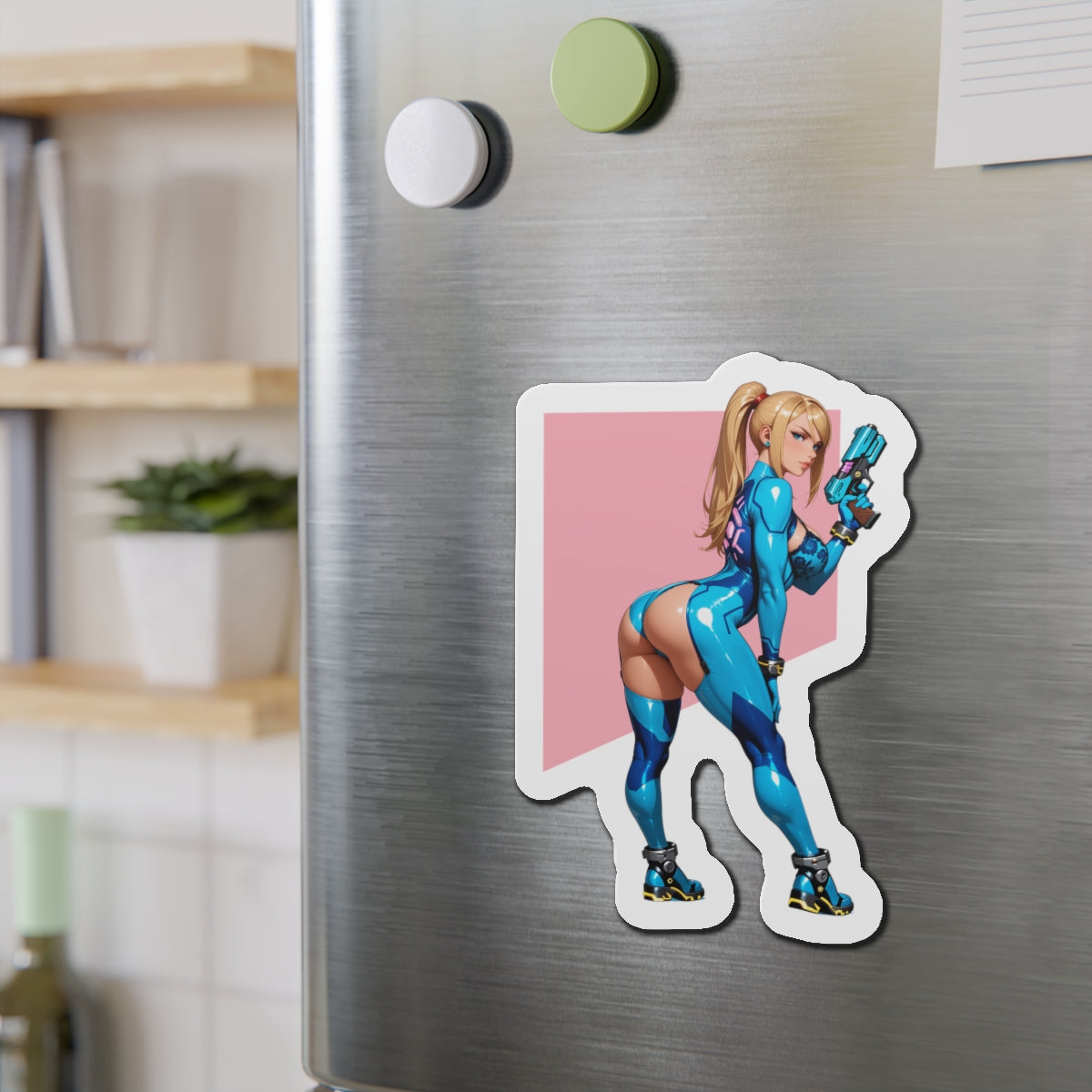 Samus-Magnet – Sexy Sci-Fi-Anime-Magnet, heiße gepanzerte Kämpferin als Kühlschrankdeko