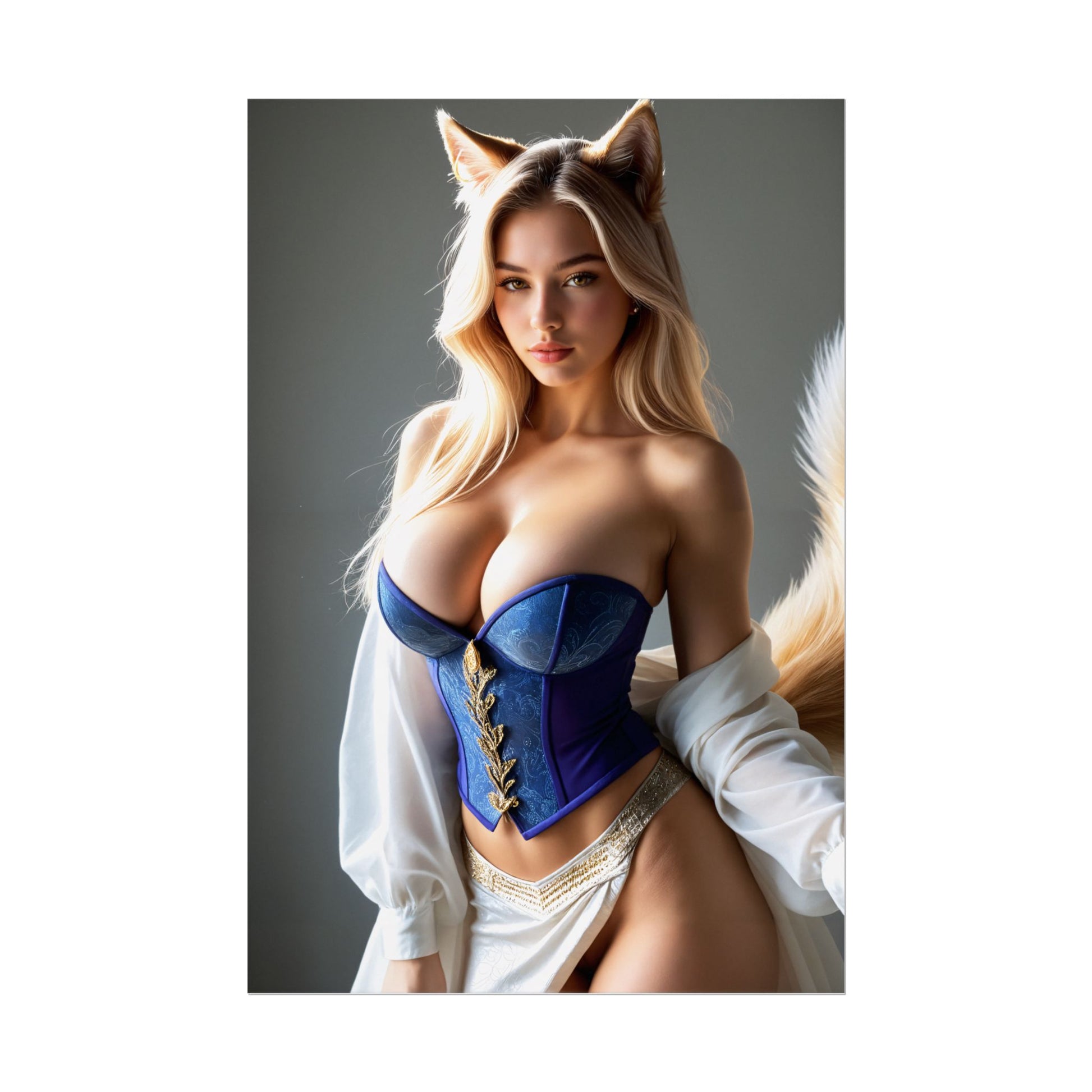 Цей кінематографічний аніме-арт зображує Арі — чарівний дух лисиці, відомий своєю красою та силою. Її хвости, сяючі очі та елегантна поза створюють неперевершену ауру магії та шарму, що робить цей настінний принт у стилі вайфу ідеальним для шанувальників аніме та ігор.