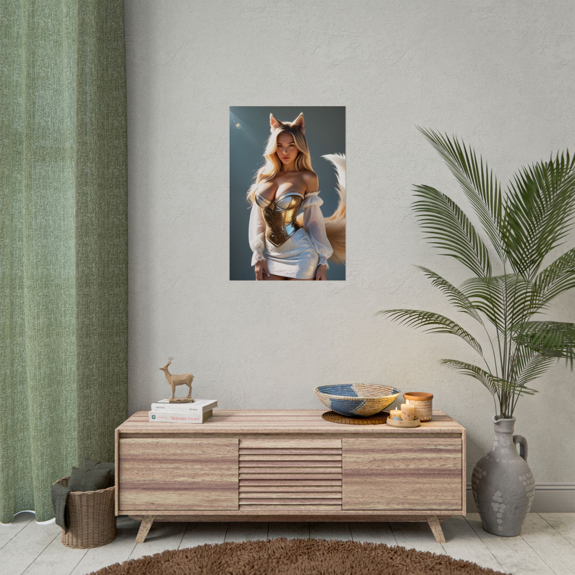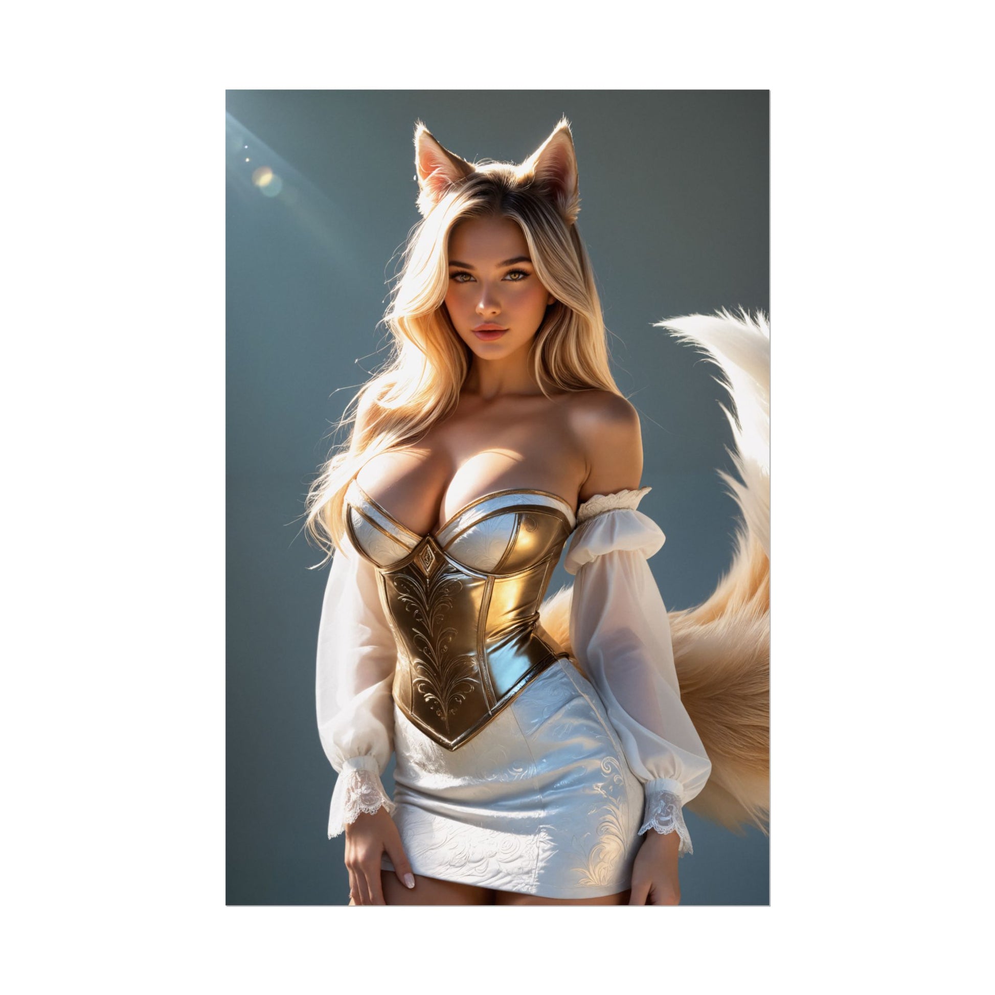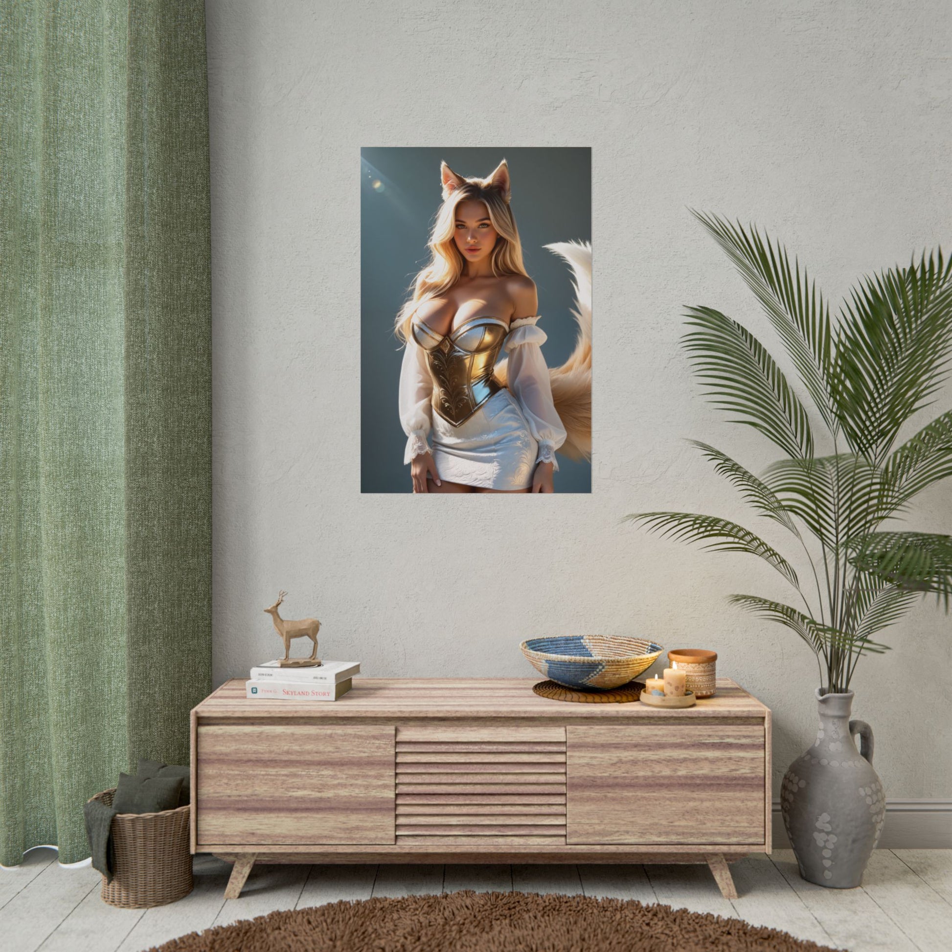 Цей кінематографічний аніме-арт переосмислює Арі як граціозну та містичну дев'ятихвосту лисицю — сяючу, впевнену та заворожливу. Її ефірне сяйво та м'яка енергія створюють відчуття фантазії та елегантності, що робить цей настінний принт у стилі вайфу вражаючим елементом будь-якого аніме чи геймерського інтер'єру.
