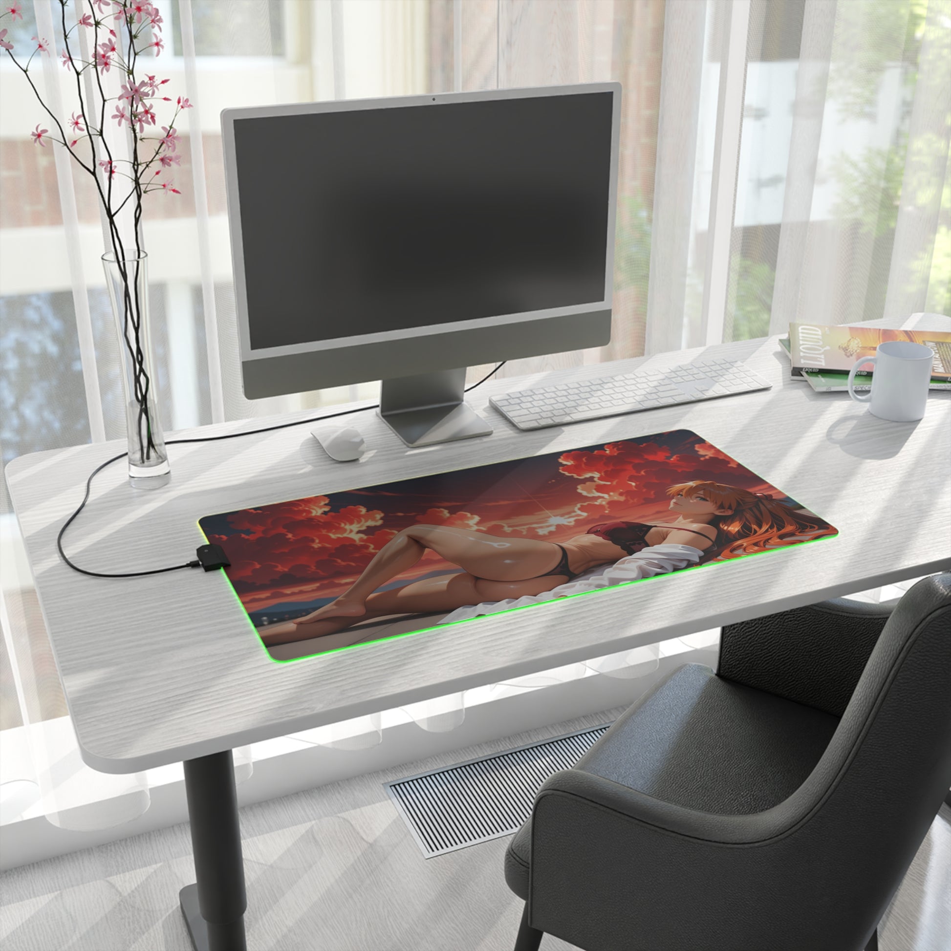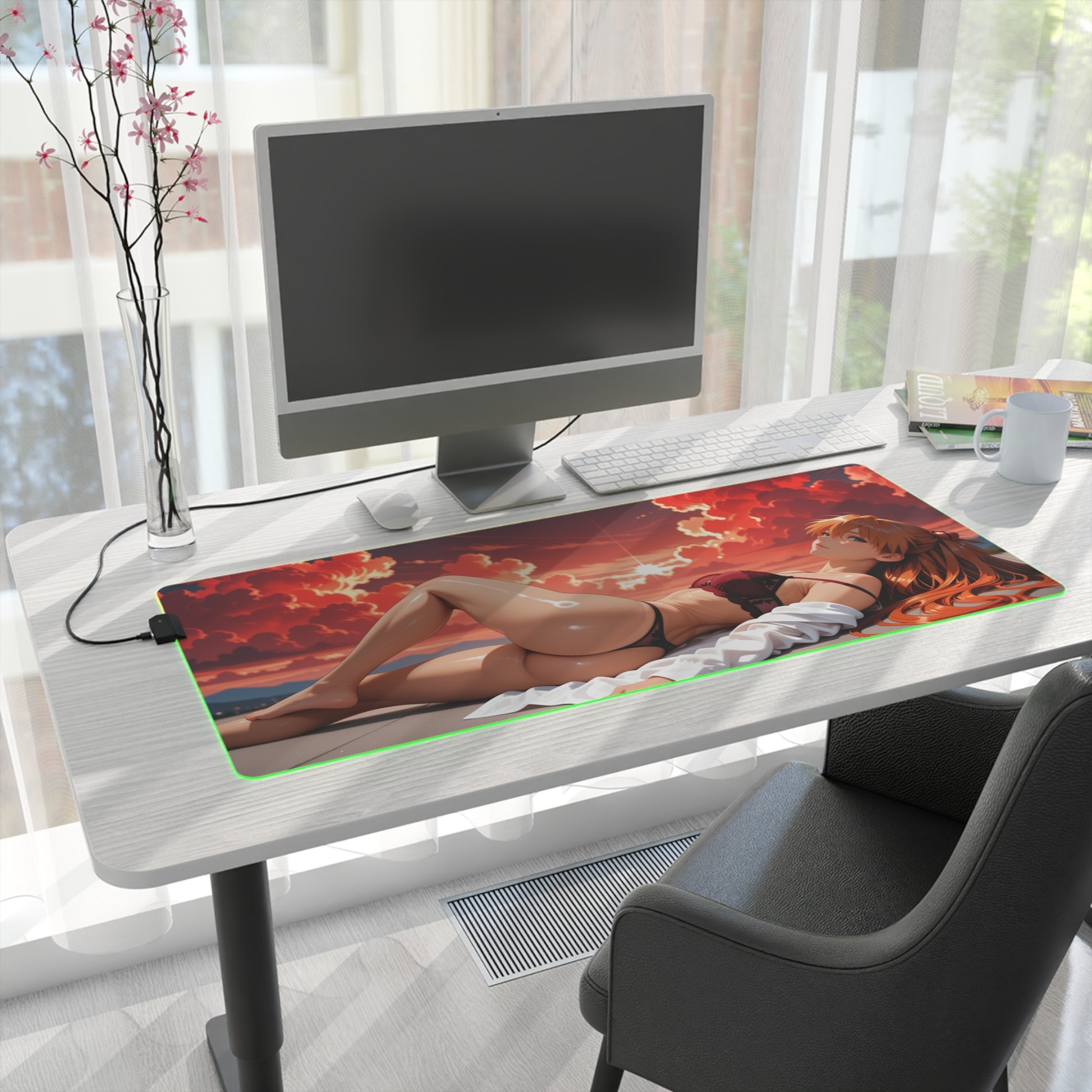 Додайте вогняної енергії до вашого робочого простору за допомогою цього світлодіодного килимка з RGB-підсвіткою із зображенням Асуки Ленглі — сміливої та впевненої вайфу, натхненної світом Євангеліона . Її гострий характер, безстрашний погляд та вражаюча червона естетика надають вашому ігровому або творчому робочому простору потужної та динамічної присутності.