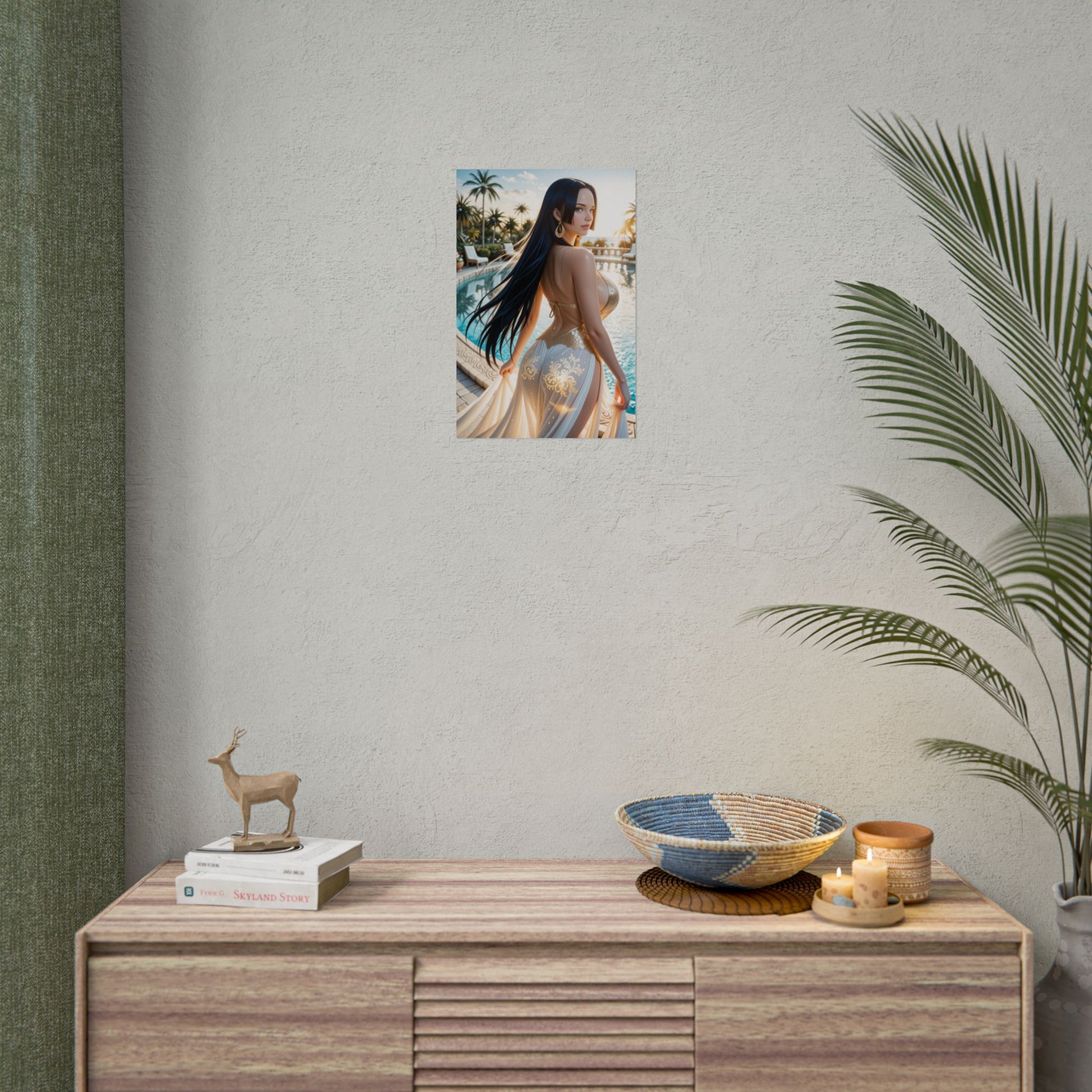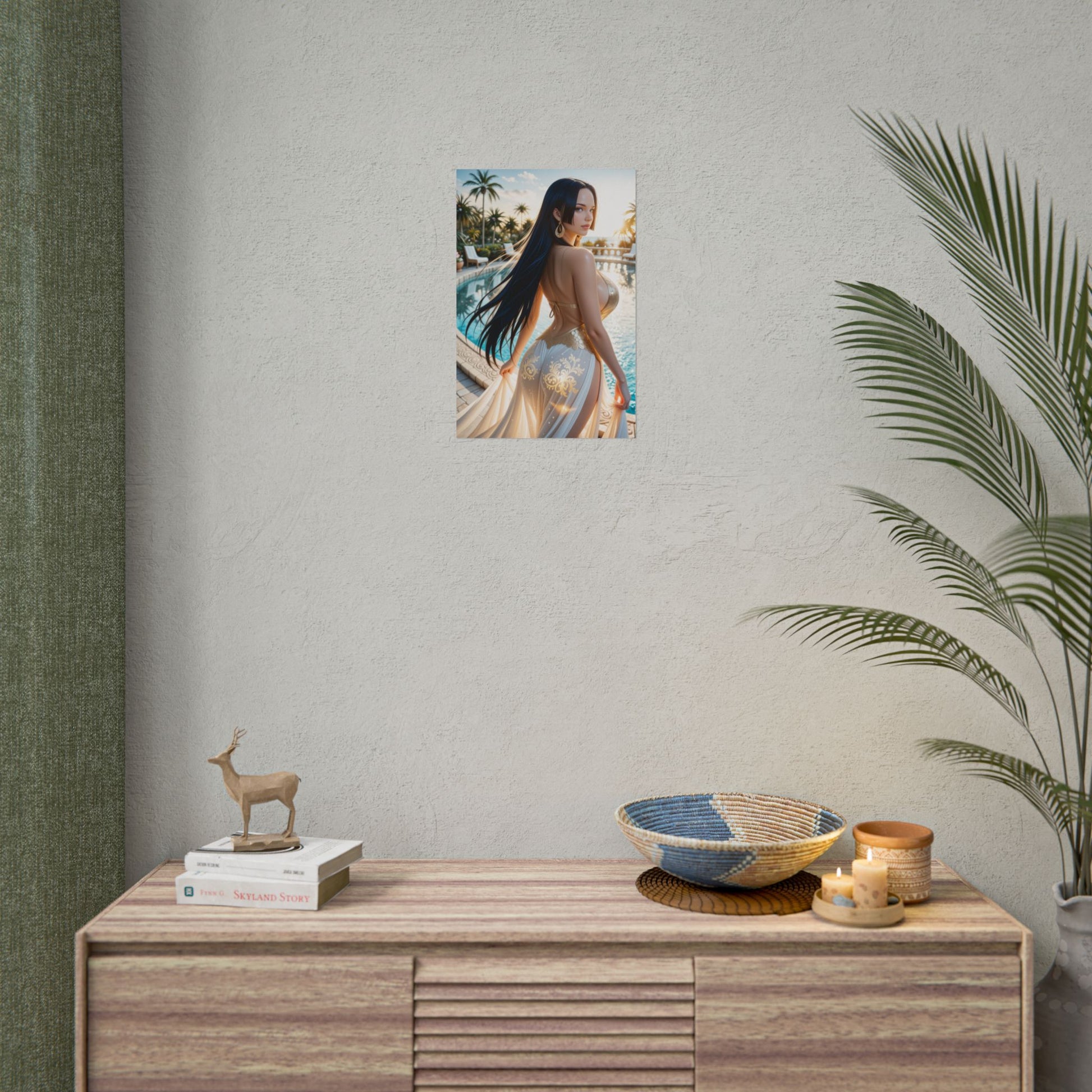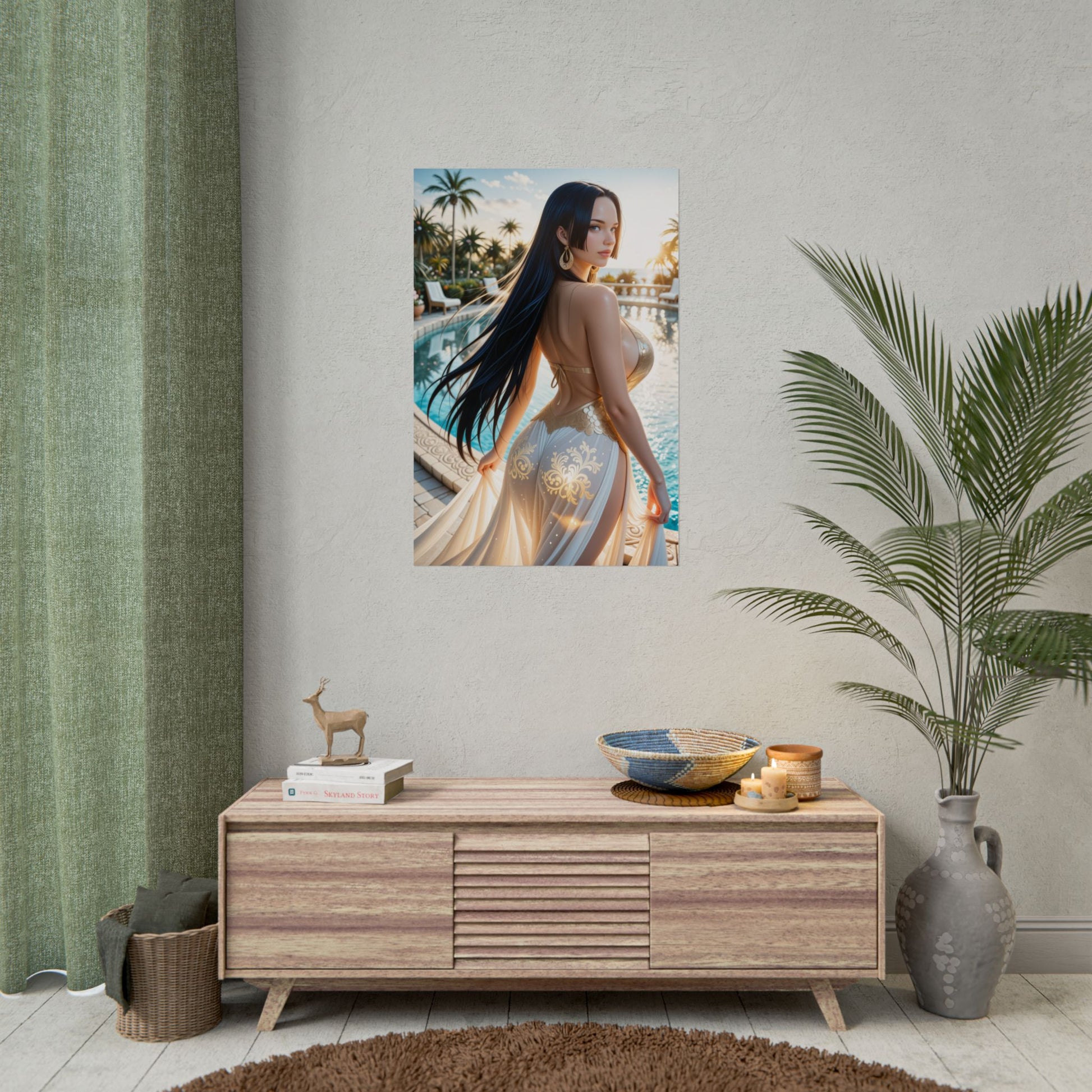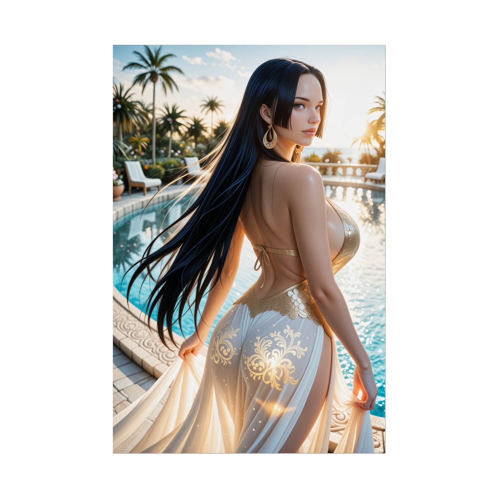 Цей кінематографічний аніме-арт зображує Боа Хенкок — величну, впевнену в собі та неймовірно красиву. Її довге темне волосся, елегантний червоний одяг та владна аура втілюють її королевську чарівність та силу, що робить цей настінний принт у стилі вайфу приголомшливим центральним елементом для шанувальників аніме та манги.