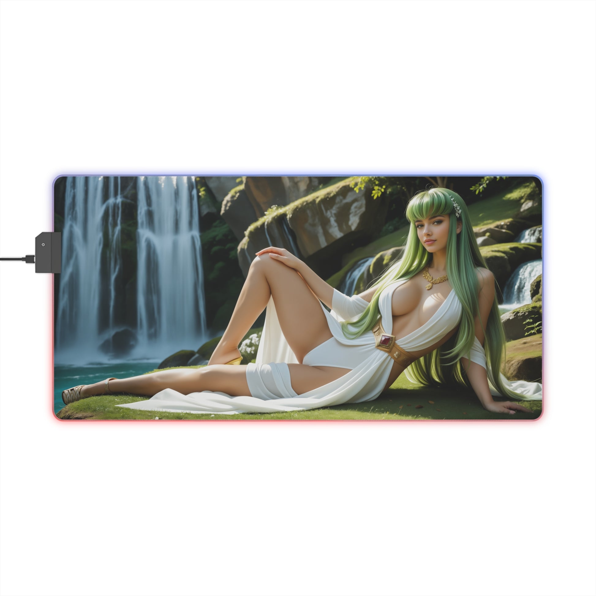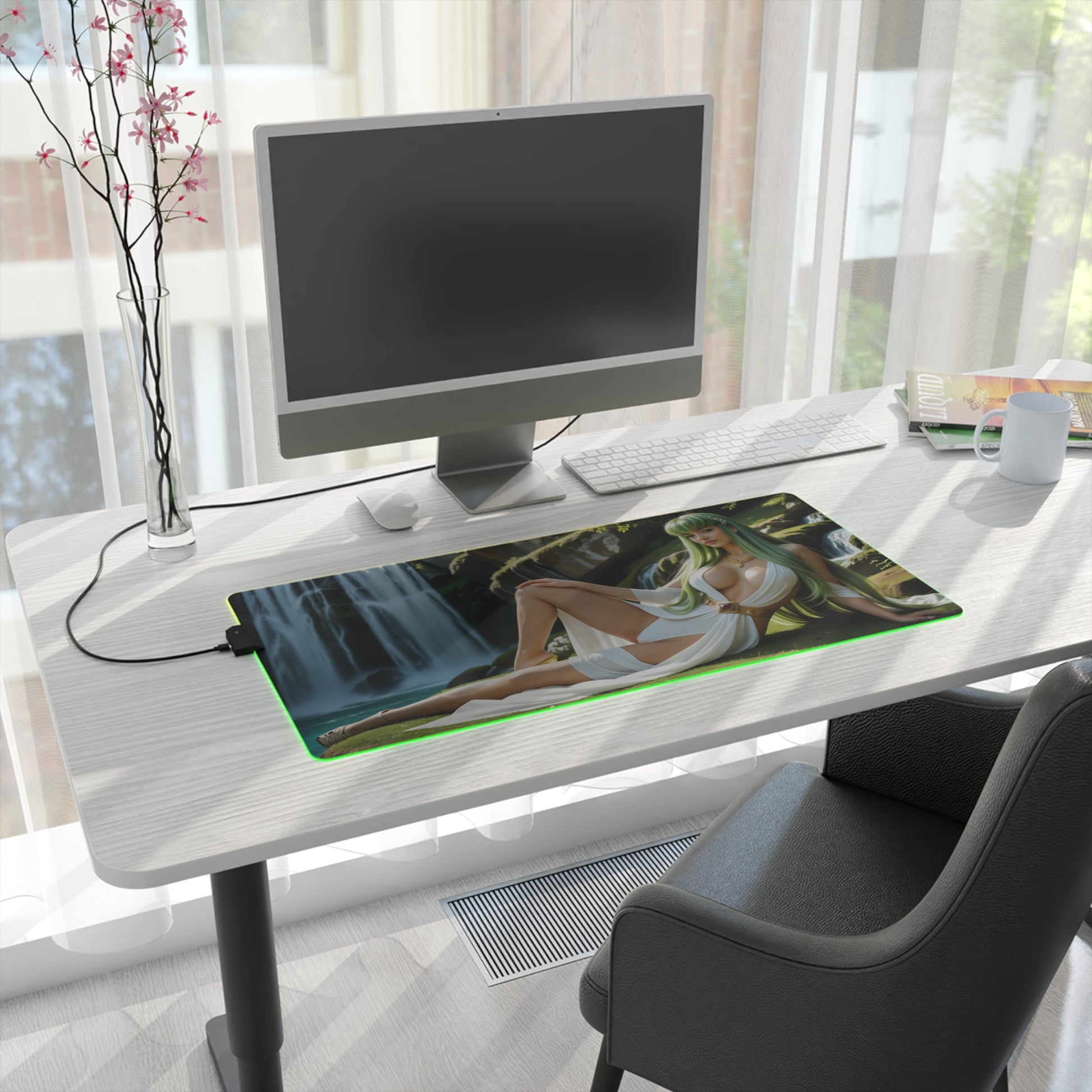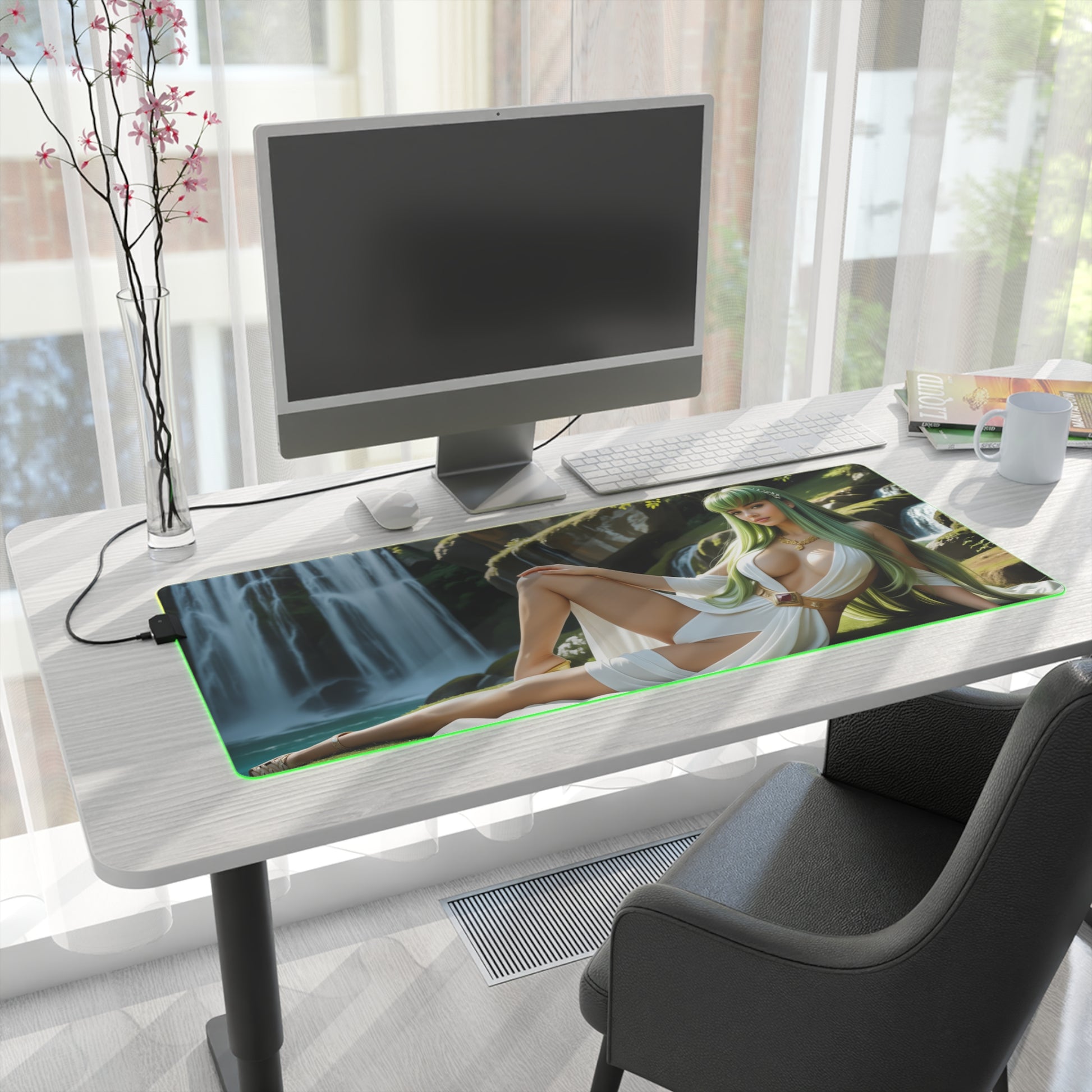 Килимок для столу CC додасть вашому столу спокійного, загадкового шарму завдяки цьому ігровому килимку зі світлодіодним RGB-підсвічуванням, на якому зображена культова зеленоволоса вайфу, натхненна світом «Коду Гіасс». Її витончений вираз обличчя, містична аура та гідна елегантність додають унікальної, безтурботної атмосфери будь-якому ігровому чи творчому робочому простору.