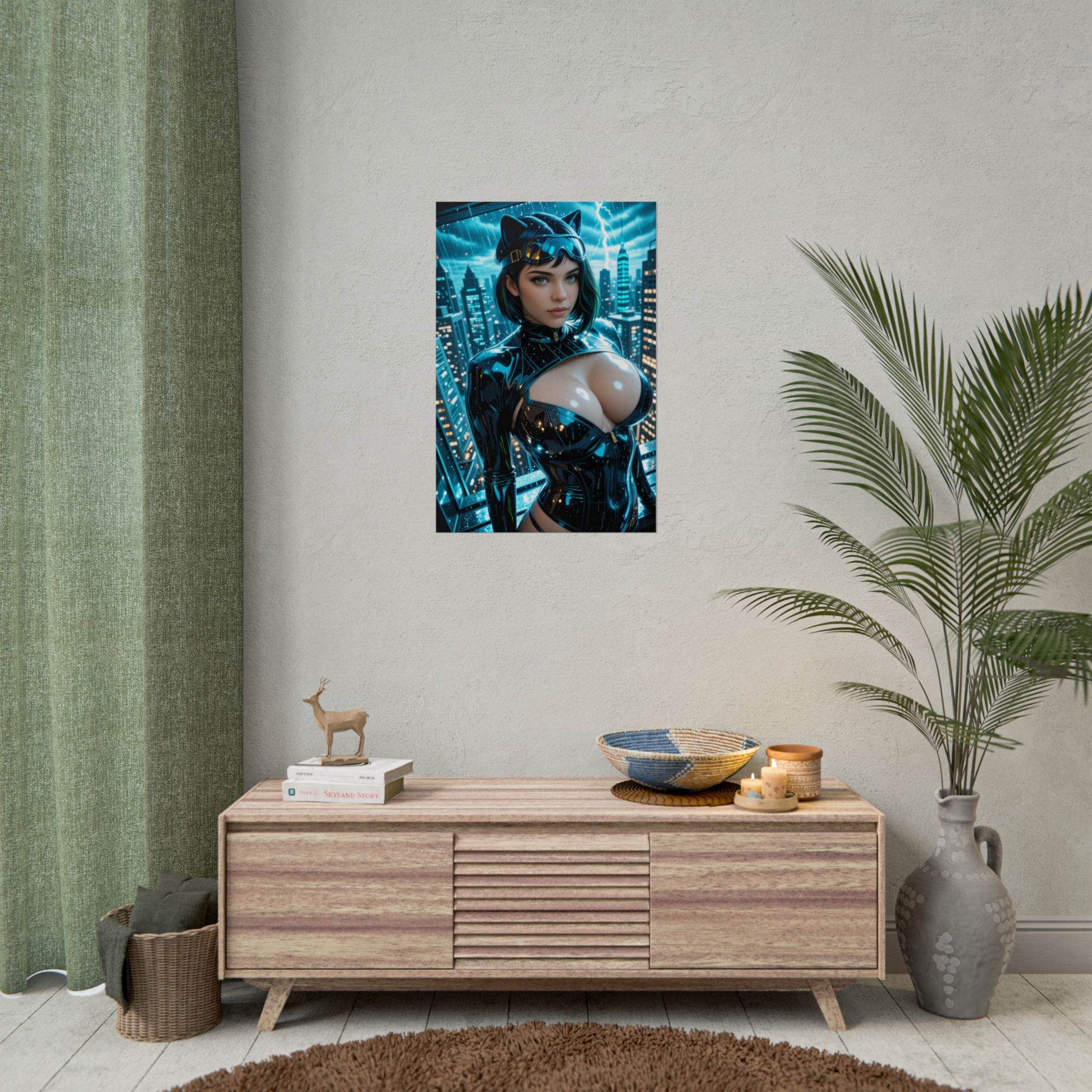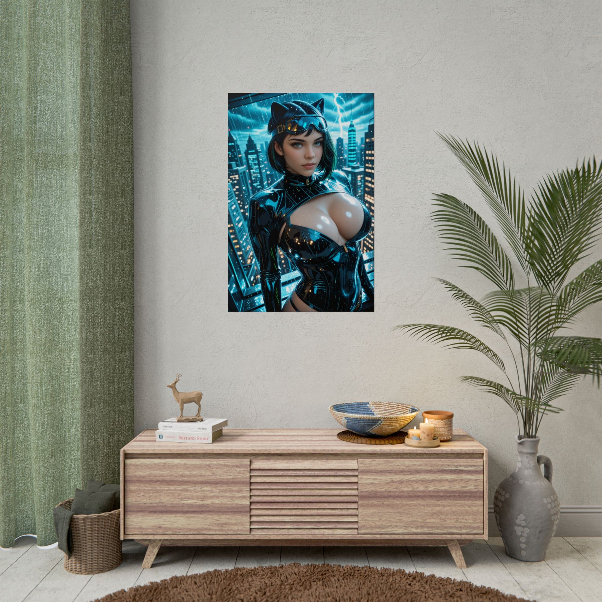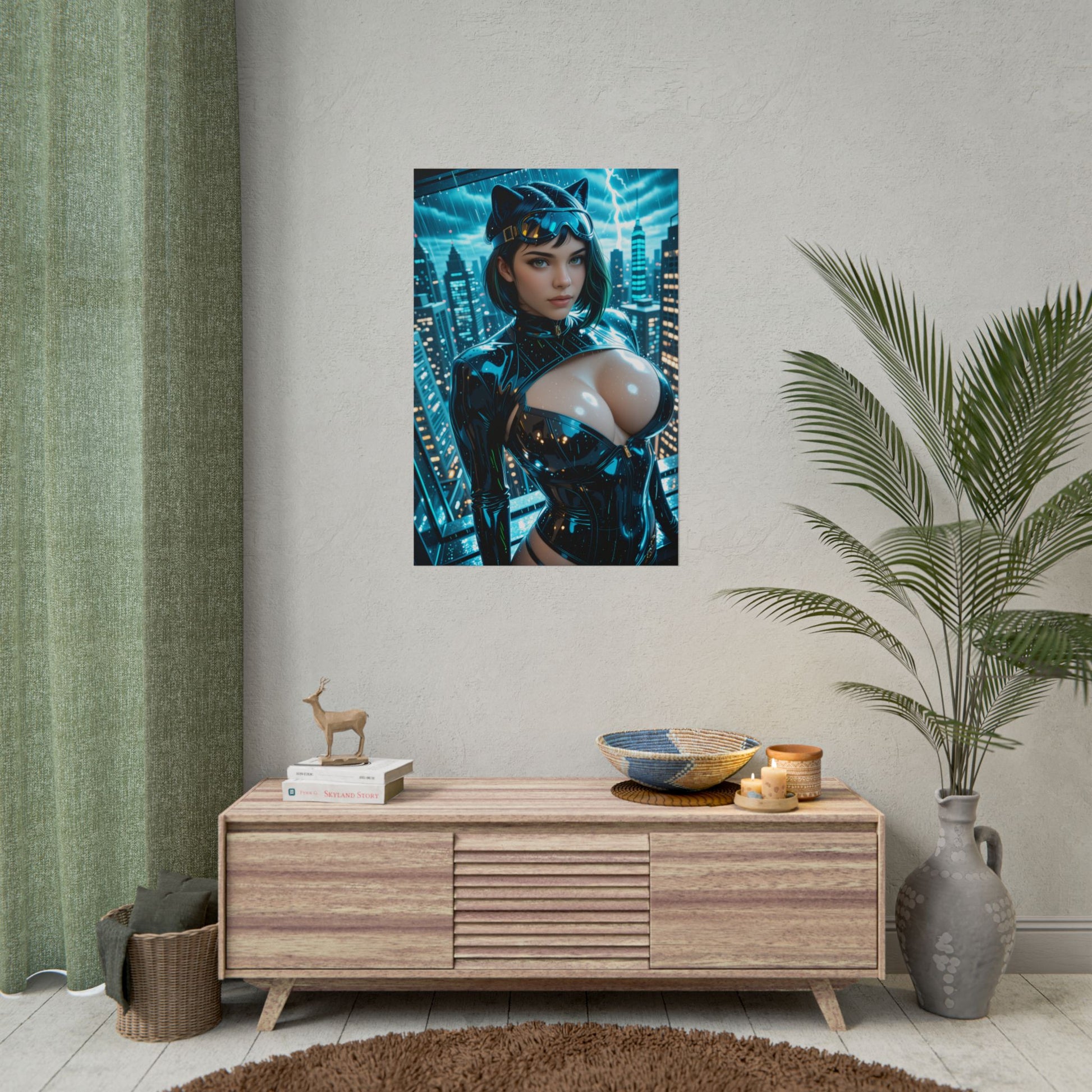 Цей кінематографічний аніме-арт зображує Жінку-кішку — витончену, впевнену в собі та неймовірно сміливу. Її чорний комбінезон, гострий погляд та зухвала поза втілюють її шарм і загадковість, що робить цей настінний принт у стилі вайфу приголомшливим доповненням до будь-якої кімнати, присвяченої аніме, коміксам чи геймерам.