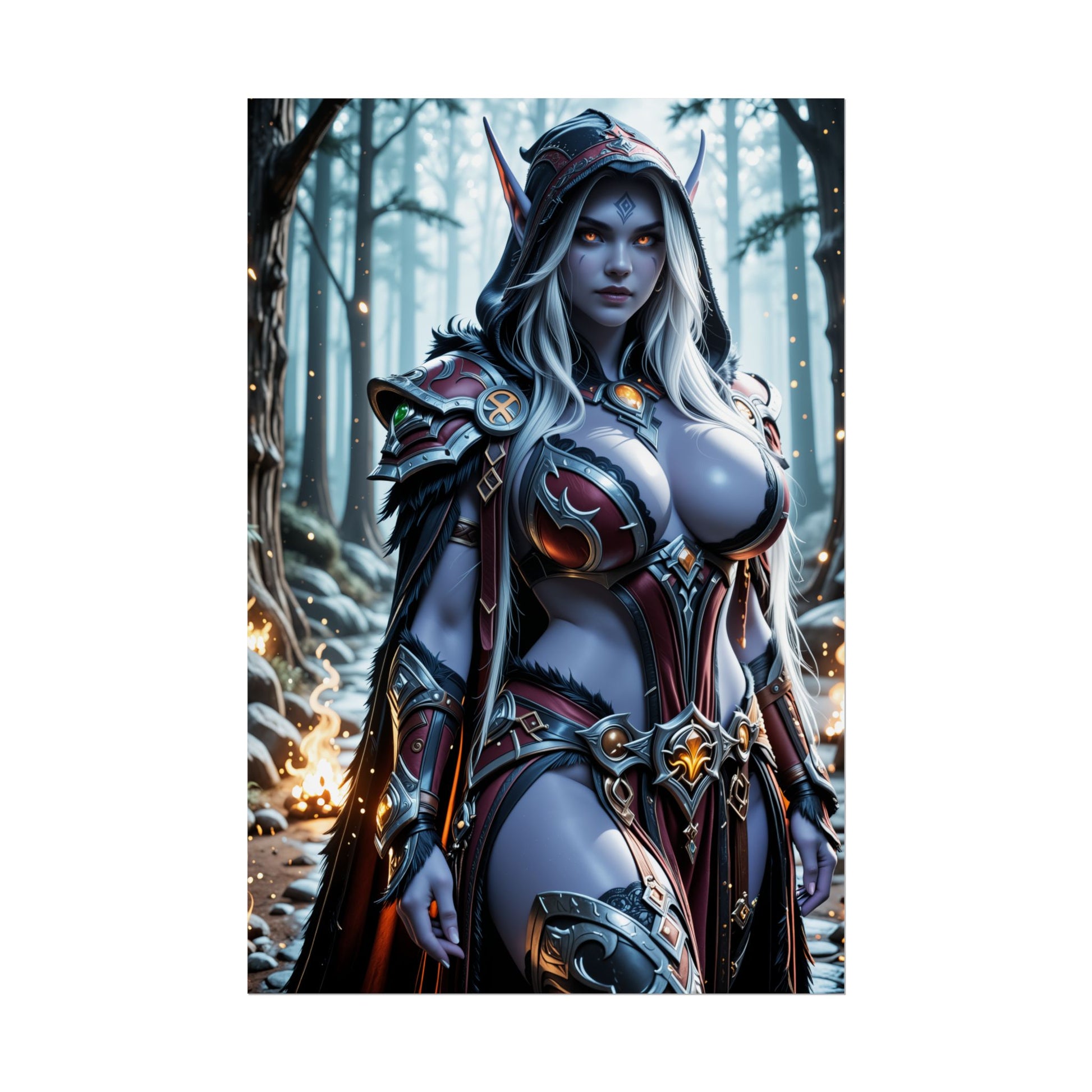 Ця кінематографічна робота в стилі аніме зображує люту ельфійську лучницю — граціозну, моторошну та загартовану в битвах. Її тіньовий плащ, сяючі очі та владна постава створюють насичений візуальний образ, що робить цей темний фентезійний настінний малюнок вайфу сміливою заявою для шанувальників ельфів та легендарних героїнь.