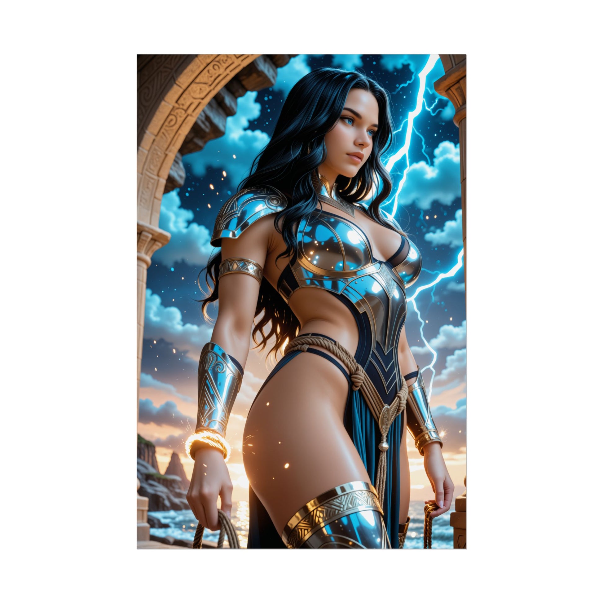 Донна Трой зображена у сміливих кінематографічних деталях — символ честі та мудрості, викуваної в битвах. Її впевнений погляд та небесні обладунки воїна роблять цей постер визначним центром уваги шанувальників супергероїв та колекціонерів фентезі.