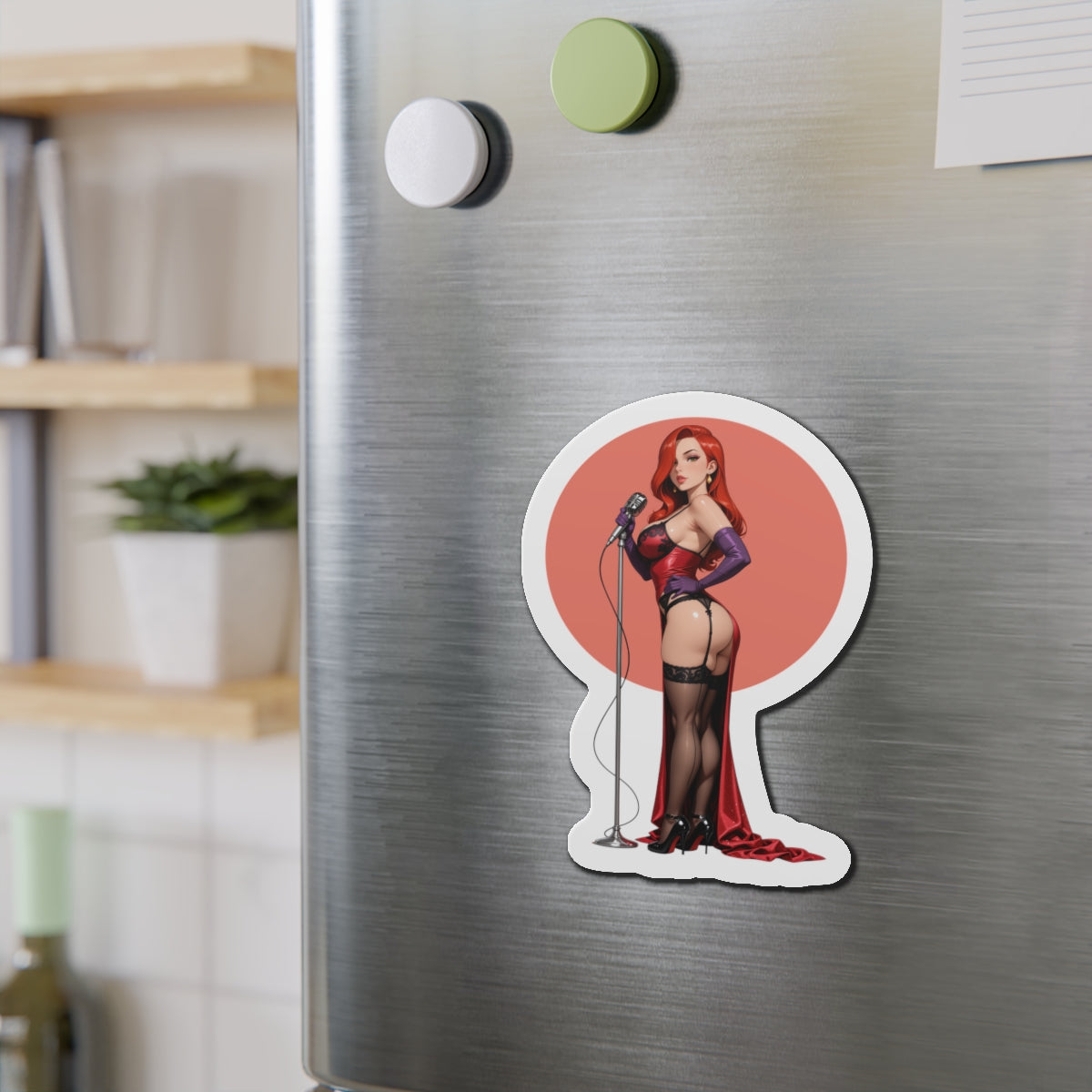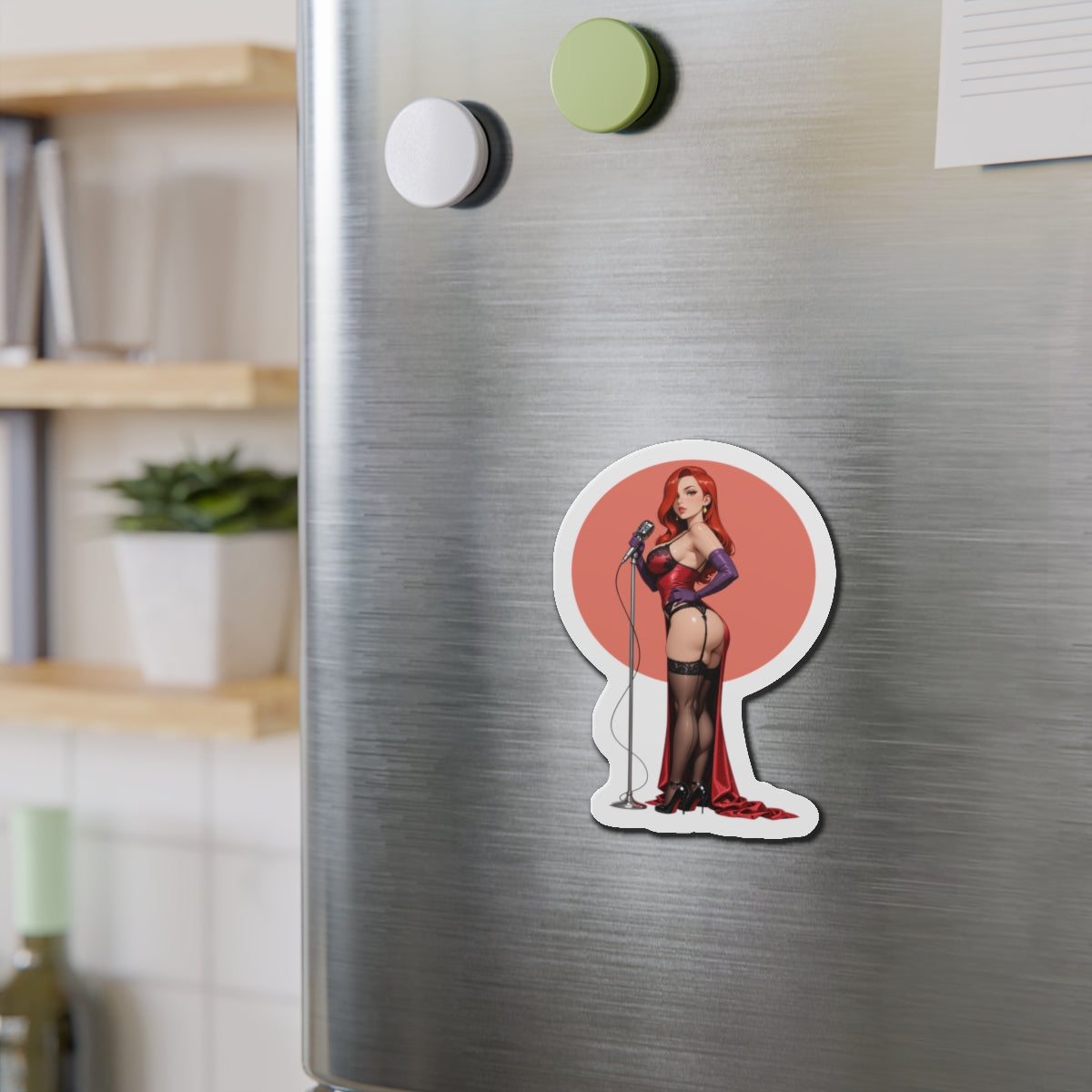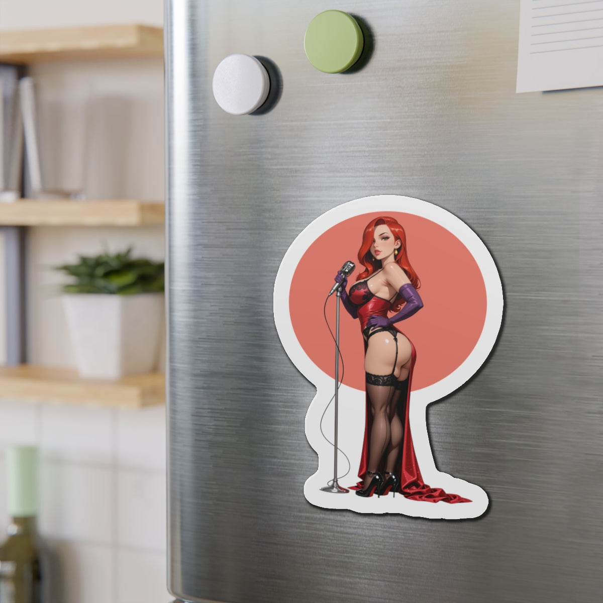 Магніт із зображенням Джесіки Реббіт — вініловий магніт преміум-класу з вирізаним зображенням культової красуні в червоній сукні в яскравому стилі аніме. Ідеально підходить для шанувальників, які люблять сміливі вигини, яскраві кольори та довговічне мистецтво з персонажами для холодильників, шафок, ігрових установок, сталевих шаф та офісних дошок.