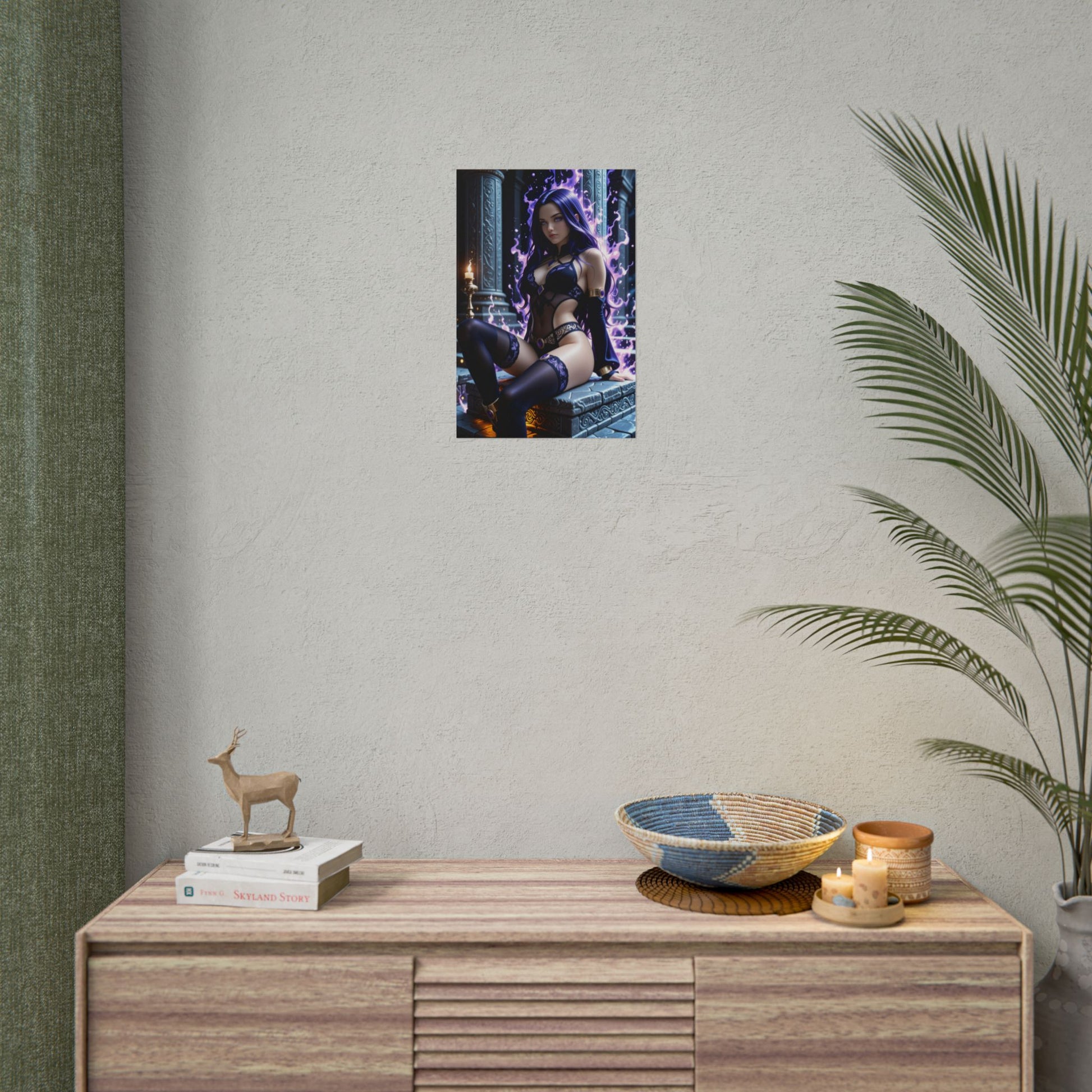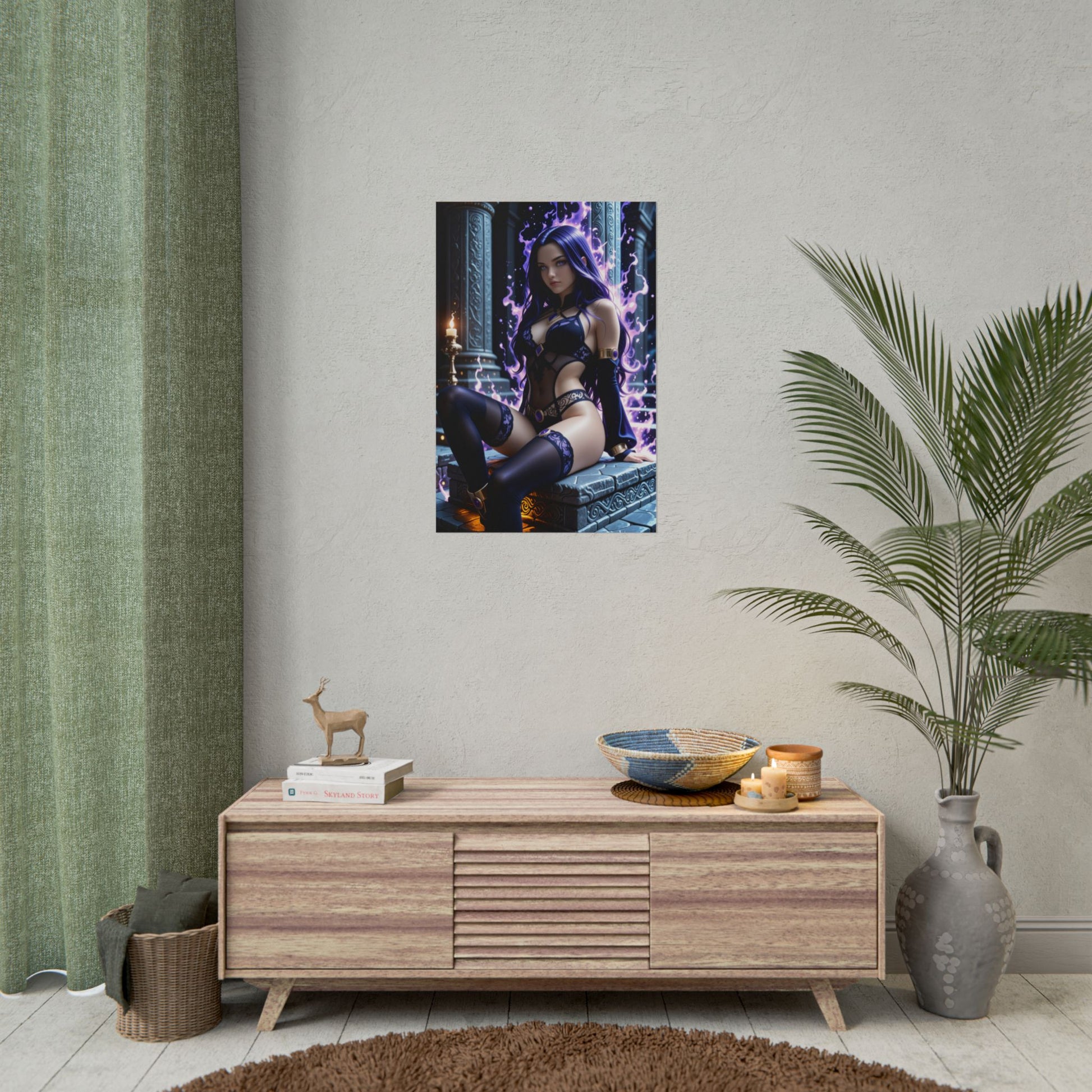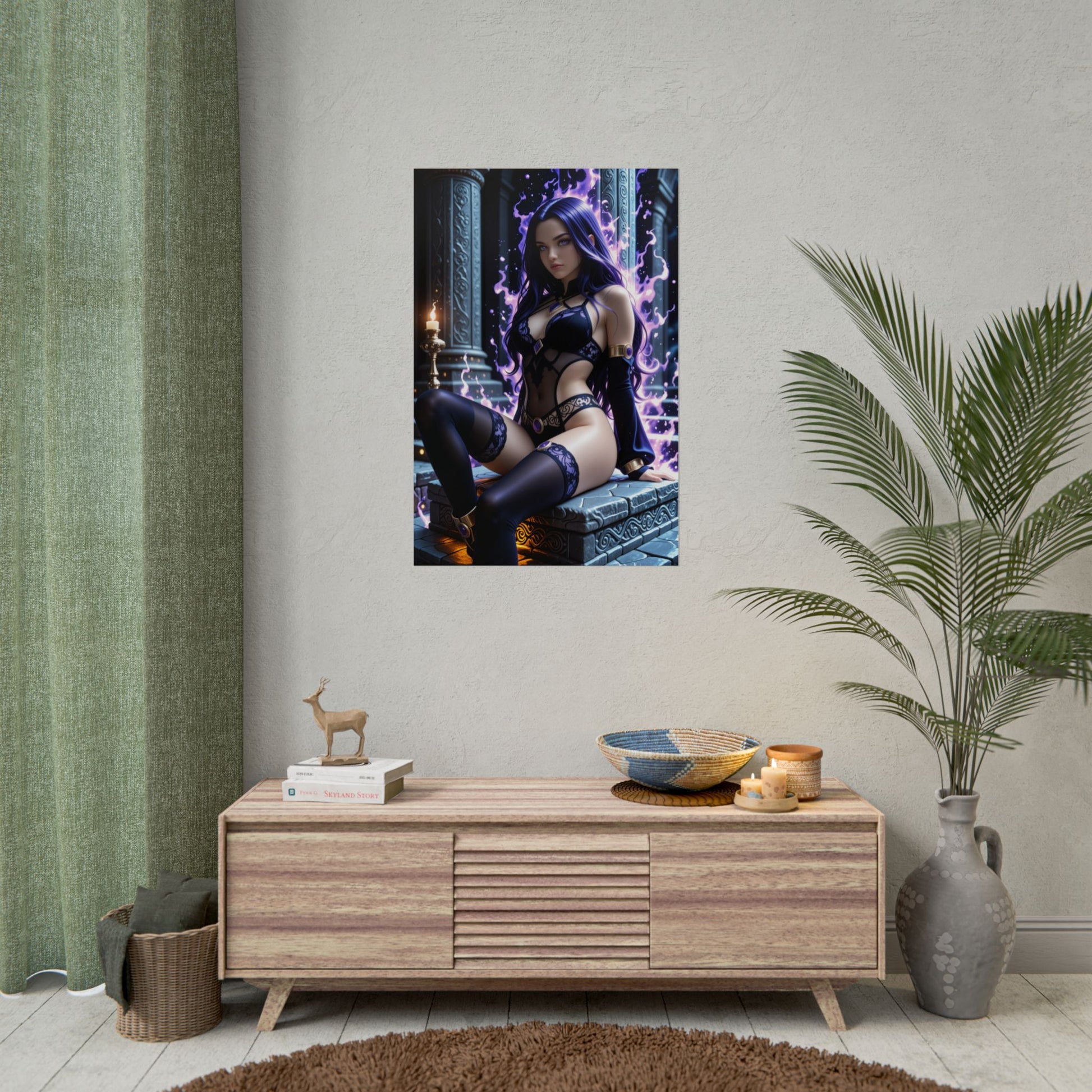 Цей принт в стилі аніме зображує Рейвен — тиху, могутню та оповиту тінню. Її фіолетовий плащ, сяючі очі та містична аура роблять її незабутньою. Ідеальний настінний витвір мистецтва для шанувальників темного фентезі та чарівних героїнь.