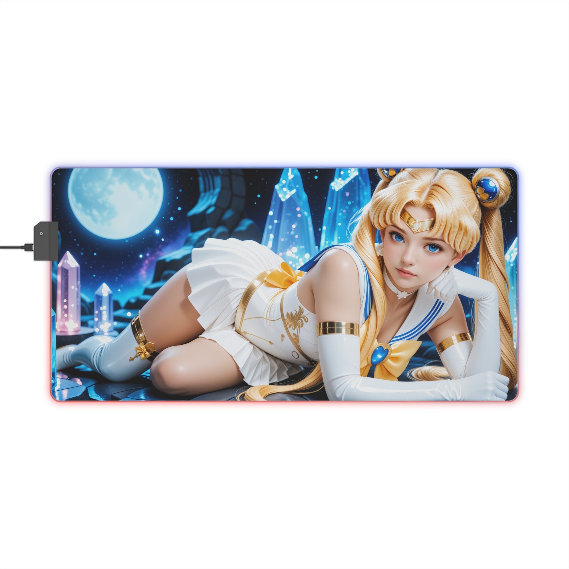 Килимок для столу Sailor Moon привнесе яскраву магічну енергію у ваше робоче місце завдяки цьому ігровому килимку зі світлодіодним RGB-підсвічуванням, натхненному культовою хранителькою любові та справедливості. Її піднесений вираз обличчя, розпущене світле волосся та небесна тема створюють веселу, натхненну атмосферу для будь-якої гри чи творчого процесу.