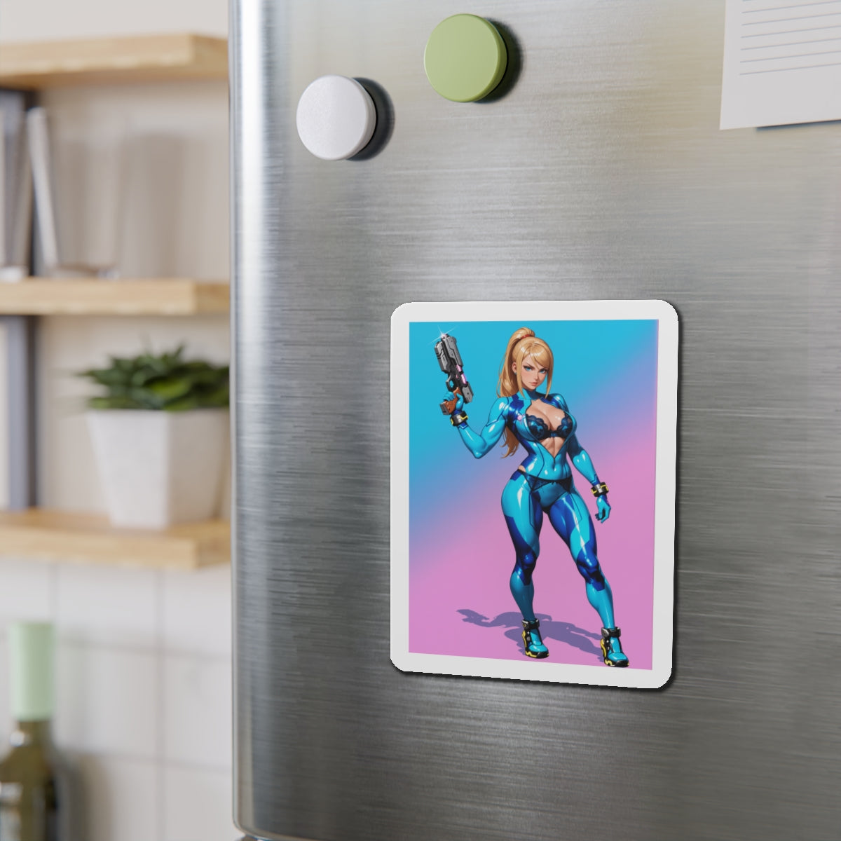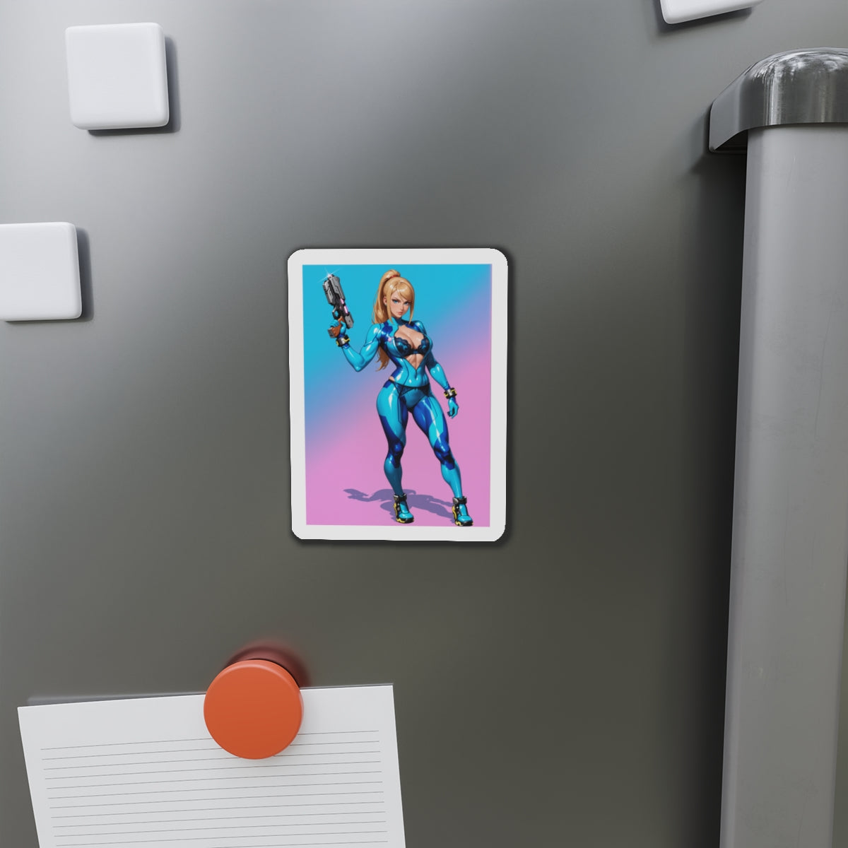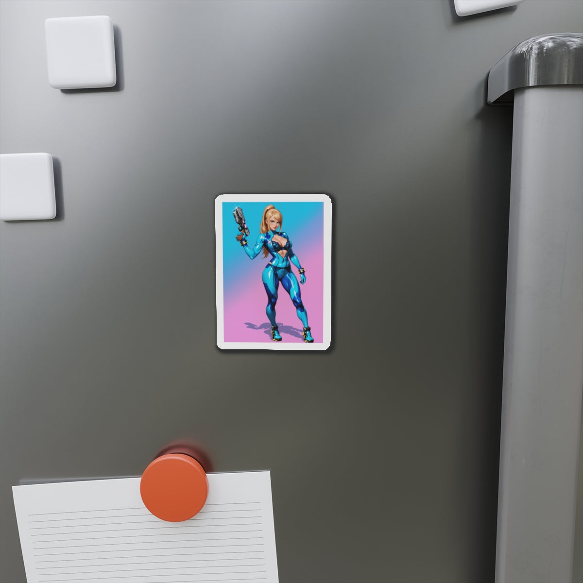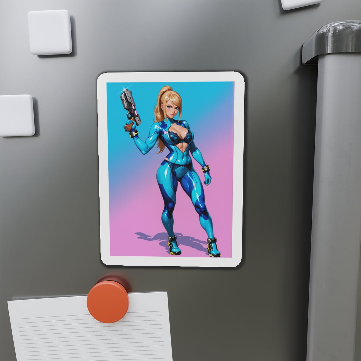 Аніме-магніт із зображенням Самус Аран — високоякісний вініловий магніт із зображенням легендарної космічної мисливиці у стилізованому аніме-арті. Ідеально підходить для додавання науково-фантастичного шарму до холодильників, дощок, ігрових кімнат, шафок та офісних приміщень.