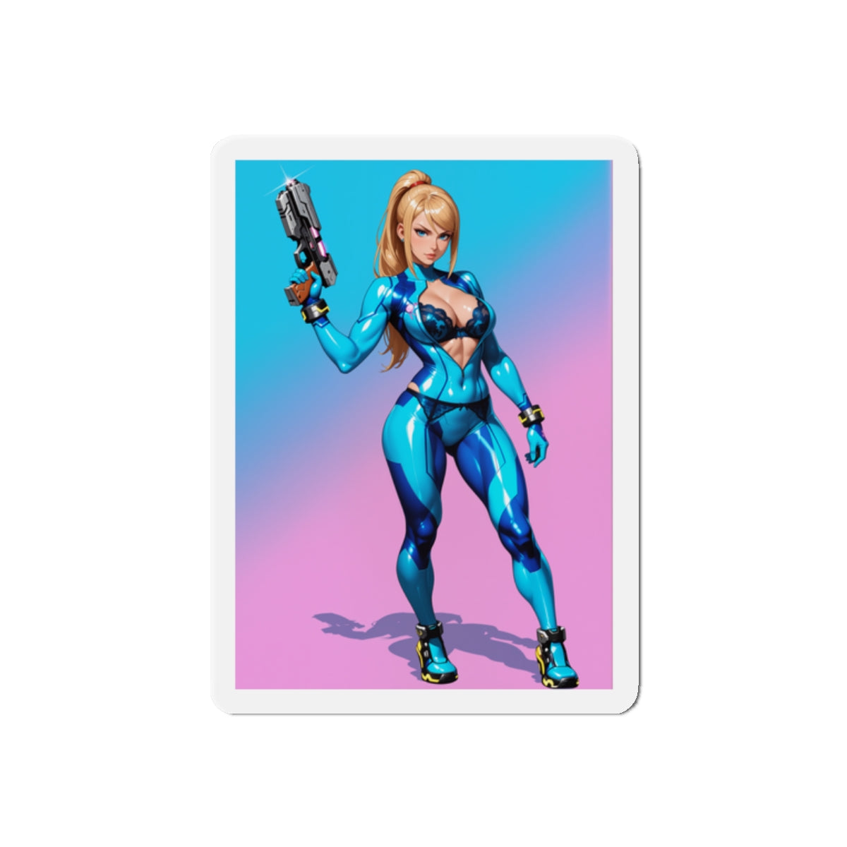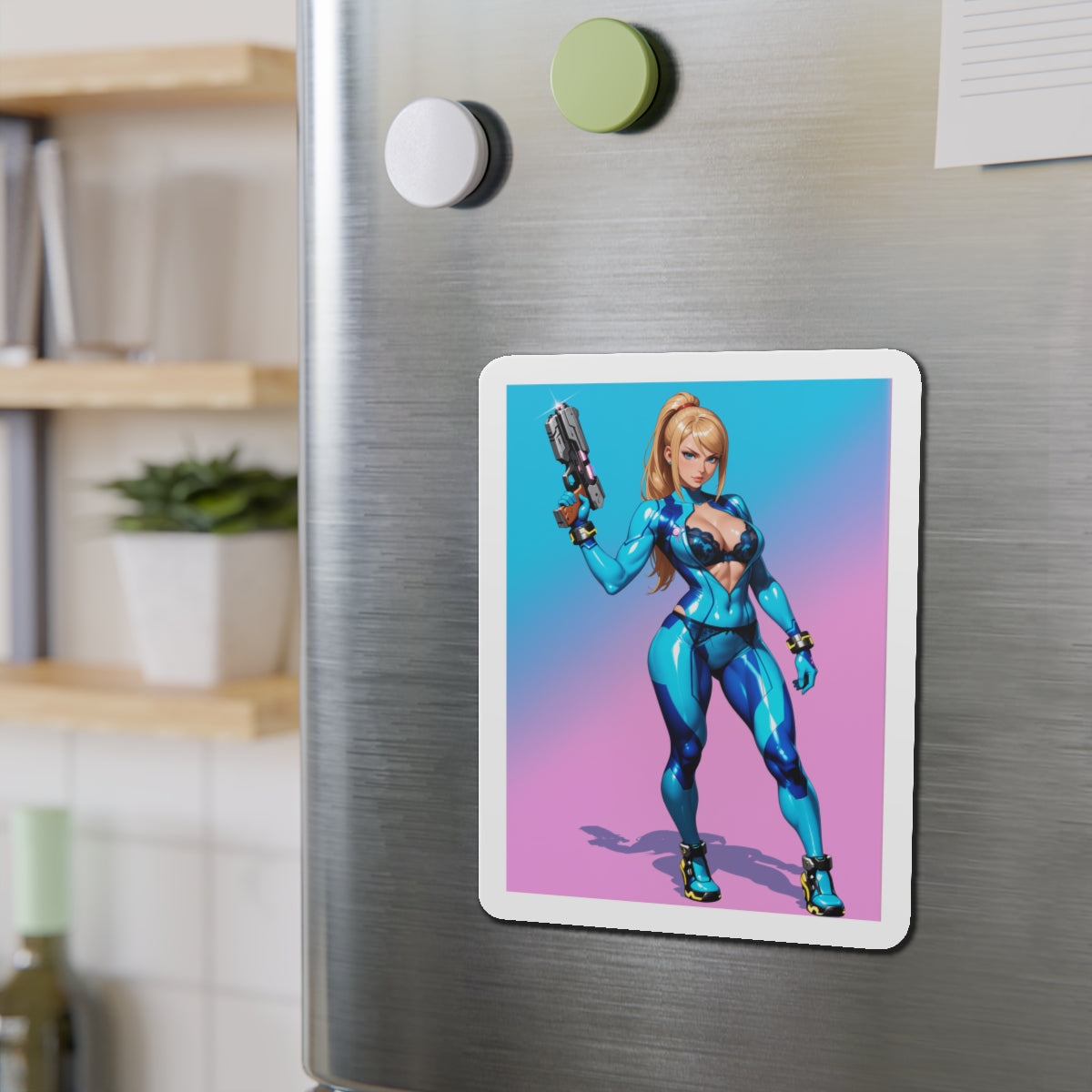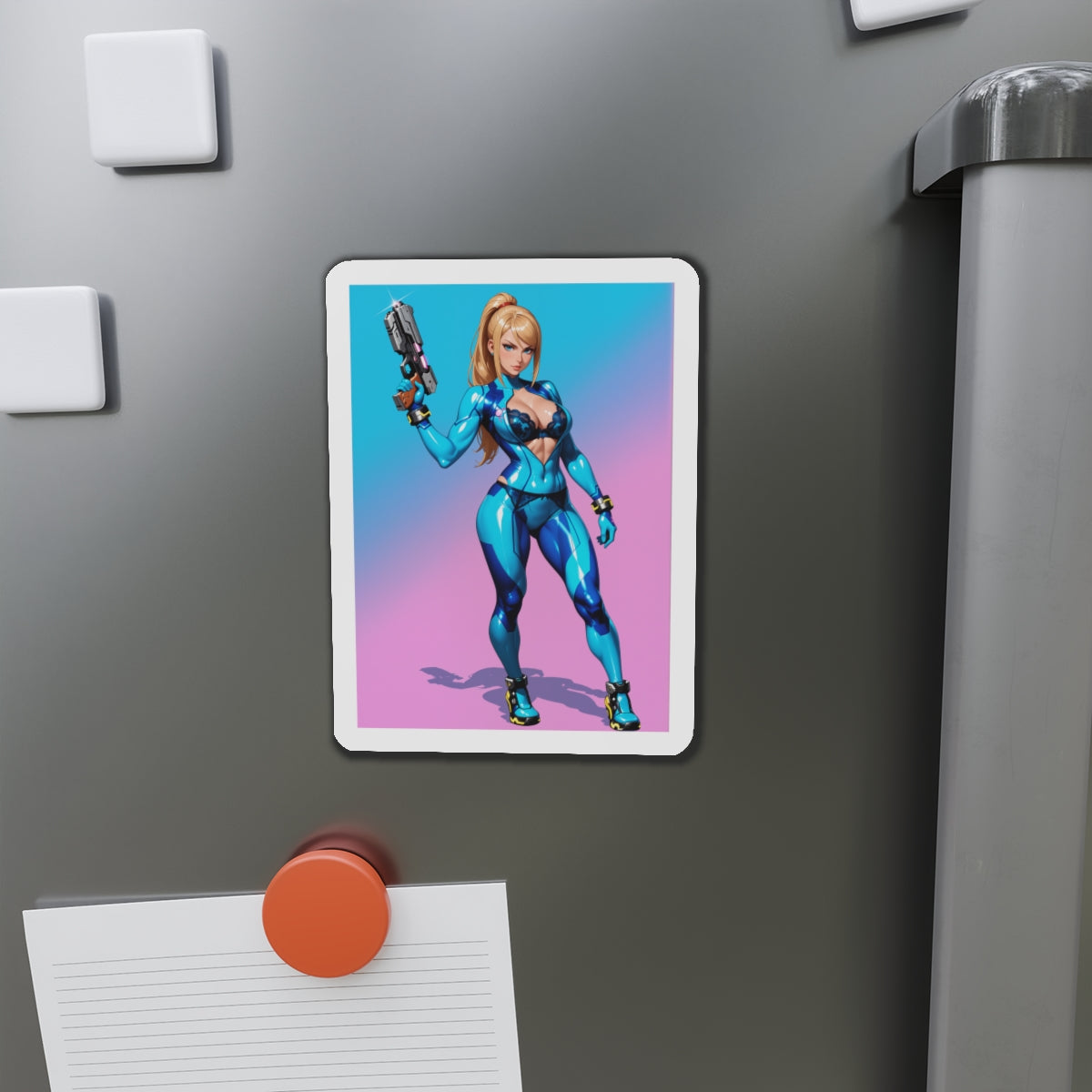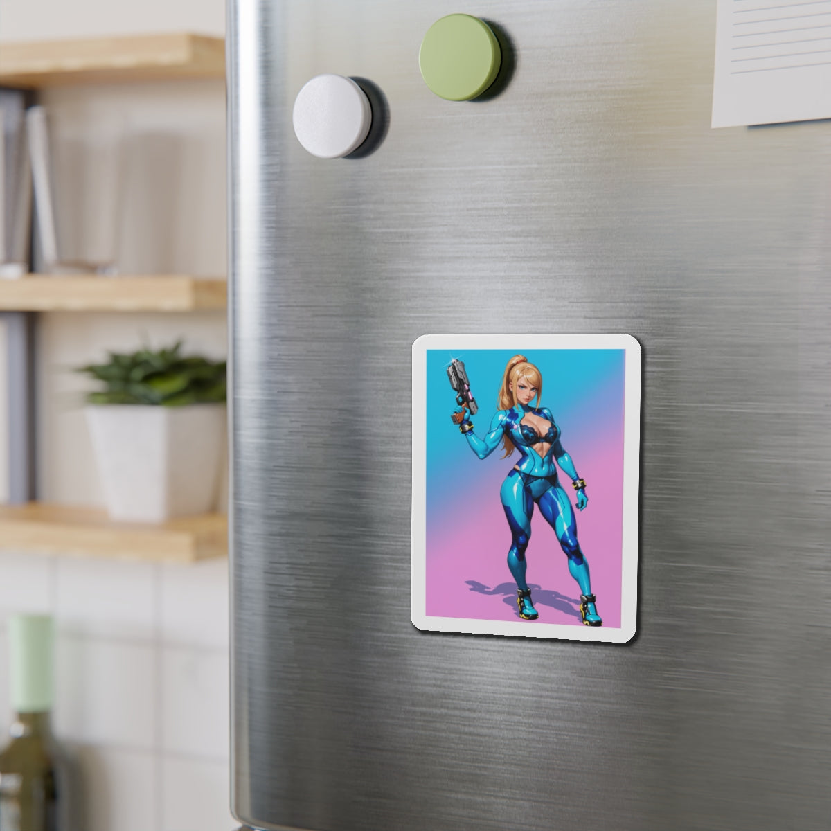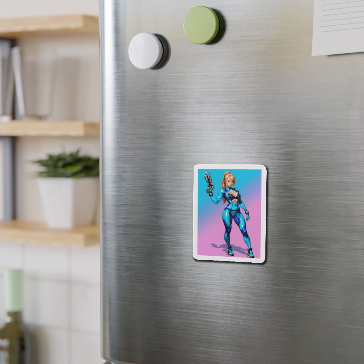 Аніме-магніт із зображенням Самус Аран — високоякісний вініловий магніт із зображенням легендарної космічної мисливиці у стилізованому аніме-арті. Ідеально підходить для додавання науково-фантастичного шарму до холодильників, дощок, ігрових кімнат, шафок та офісних приміщень.