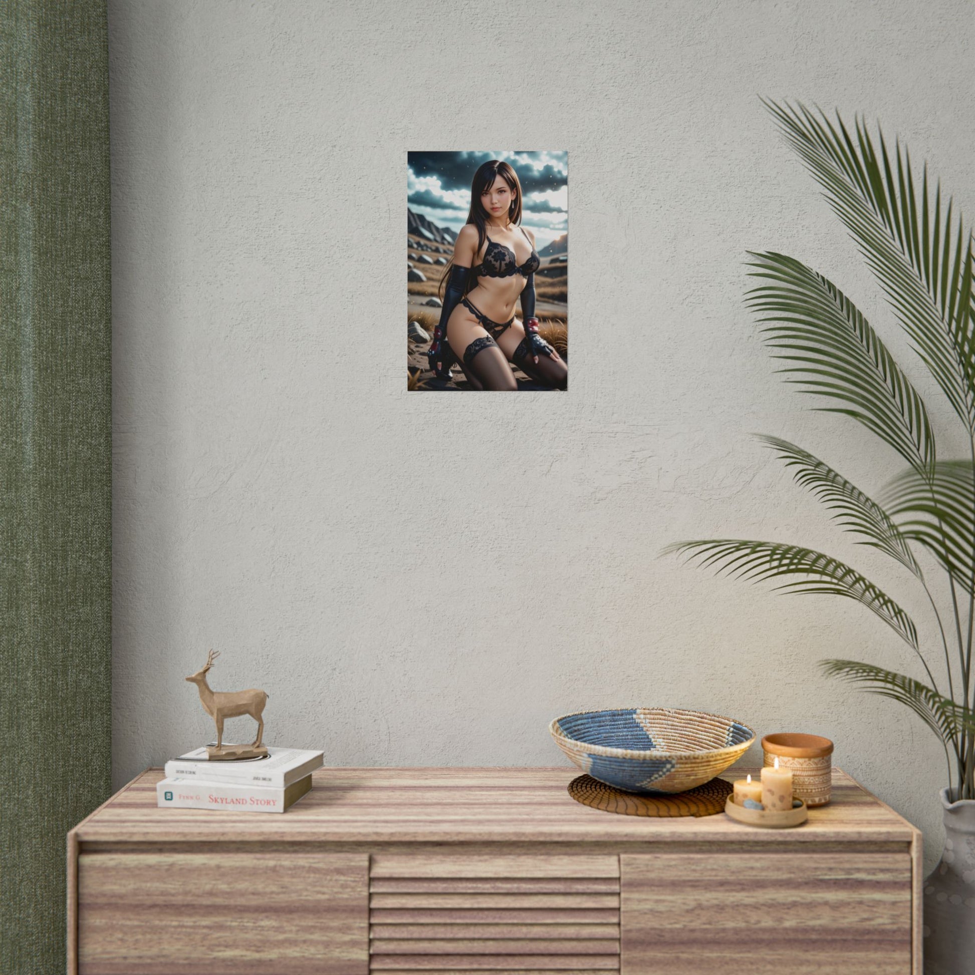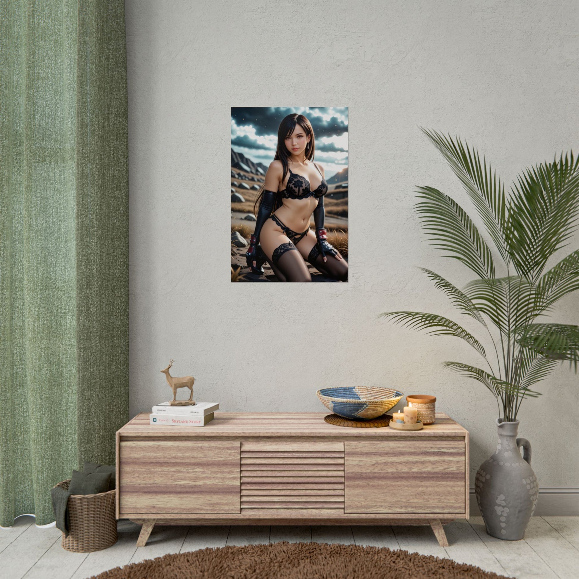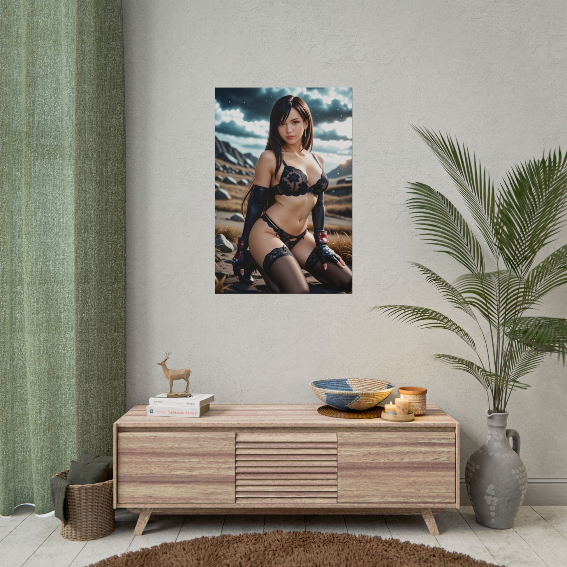 Цей кінематографічний аніме-арт зображує Тіфу Локхарт — сильну, граціозну та безмежно рішучу. Її довге темне волосся, атлетична фігура та впевнена постава поєднують красу та силу, що робить цей настінний принт у стилі вайфу ідеальним для ігрових кімнат та колекцій аніме-арту.